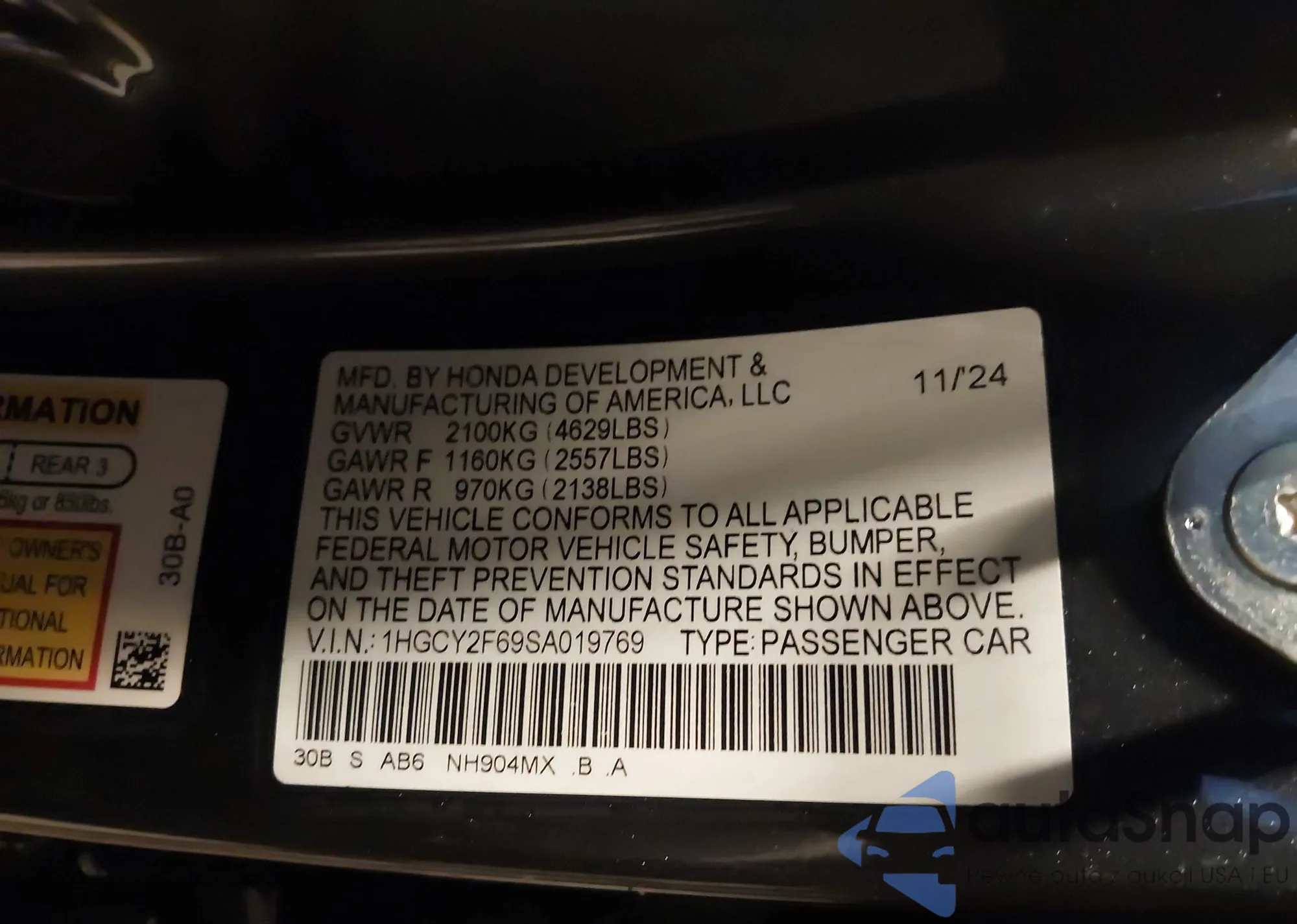 • VIN 1HGCY2F69SA019769