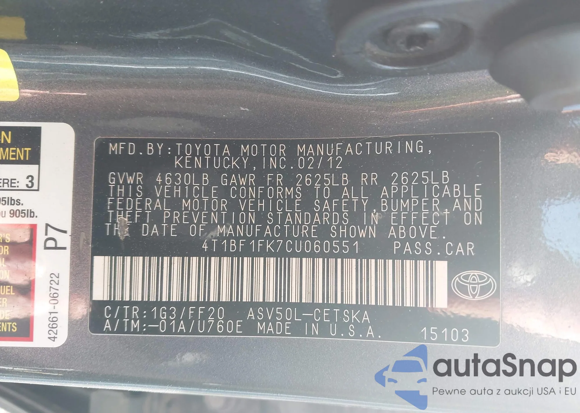 • VIN 4T1BF1FK7CU060551