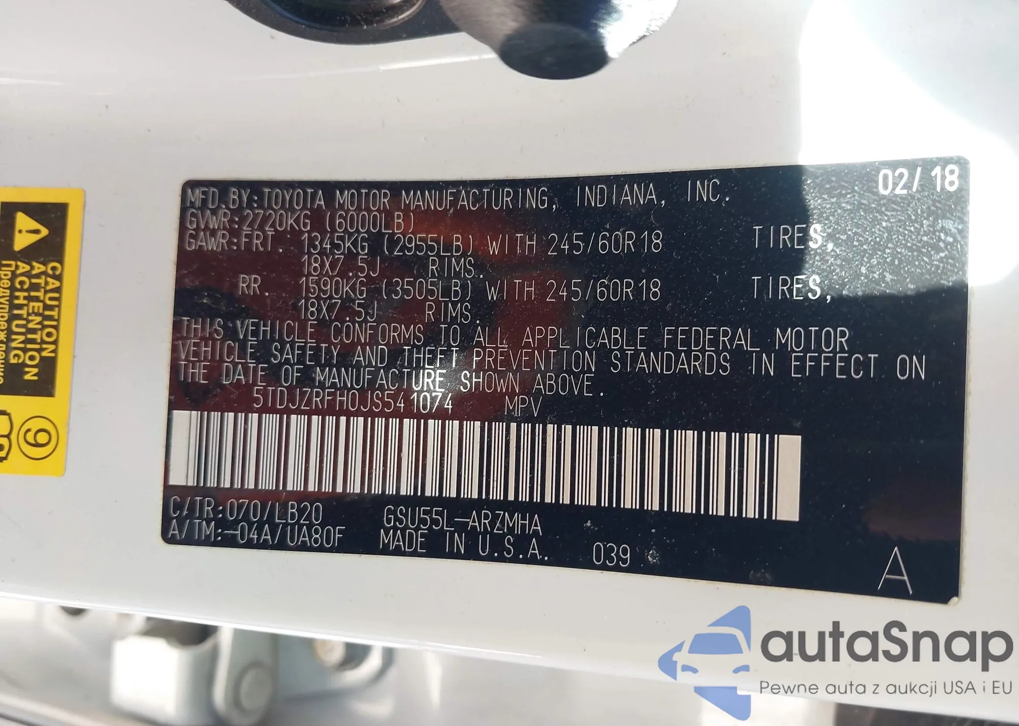 LOT: 44250158 VIN: 5TDJZRFH0JS541074