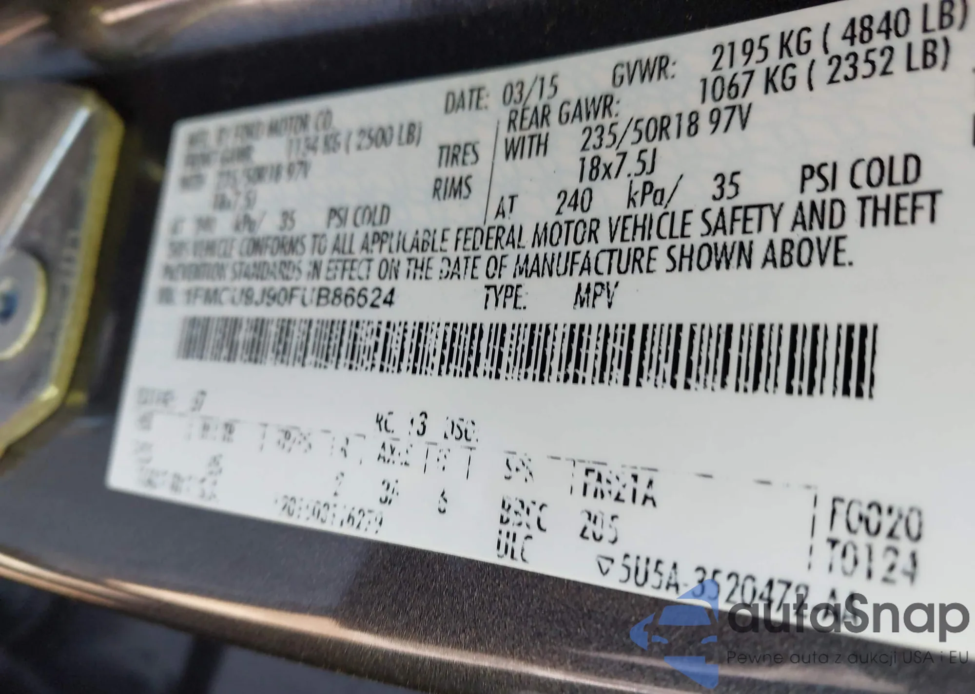 LOT: 44269695 VIN: 1FMCU9J90FUB86624
