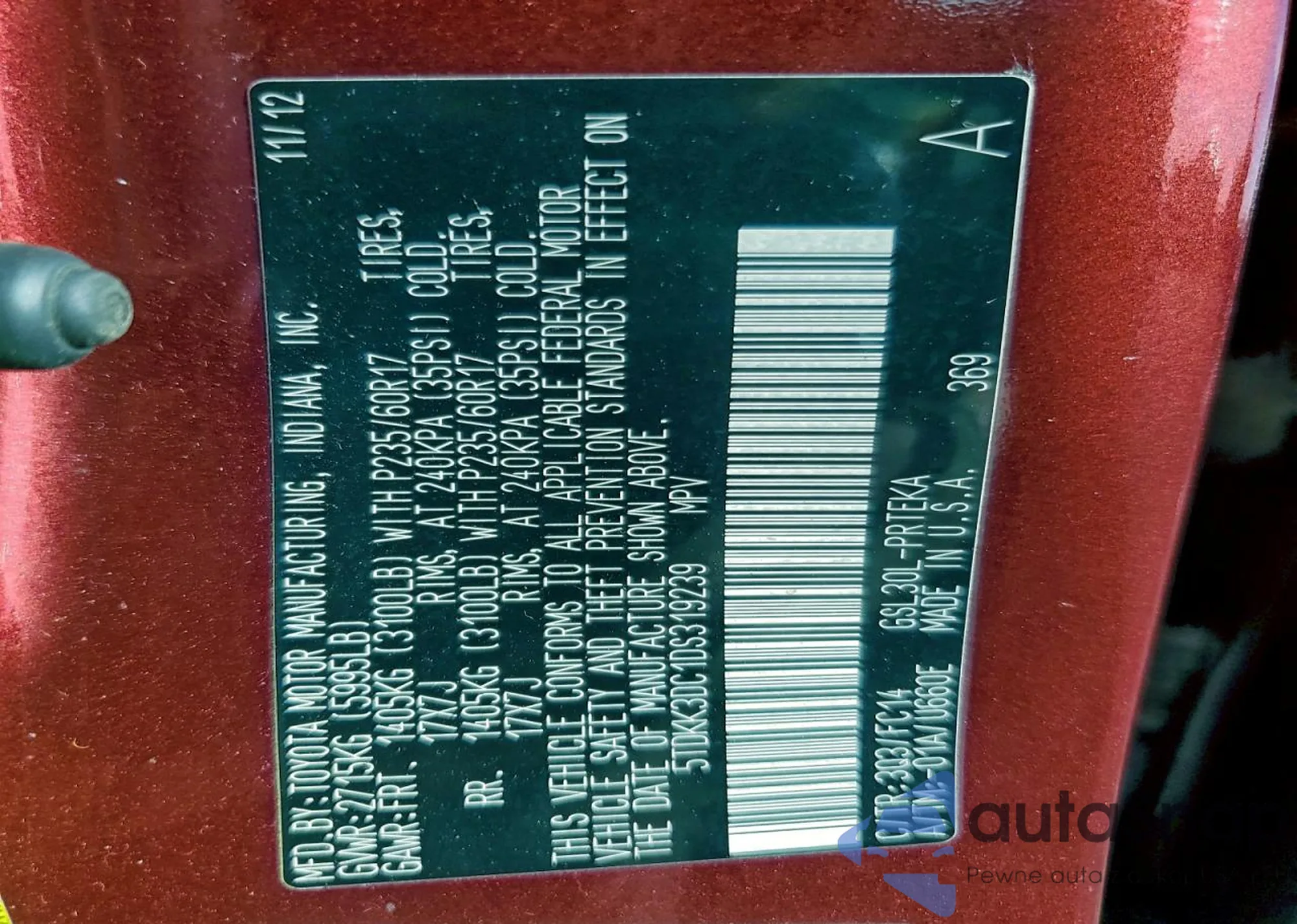 • VIN 5TDKK3DC1DS319239
