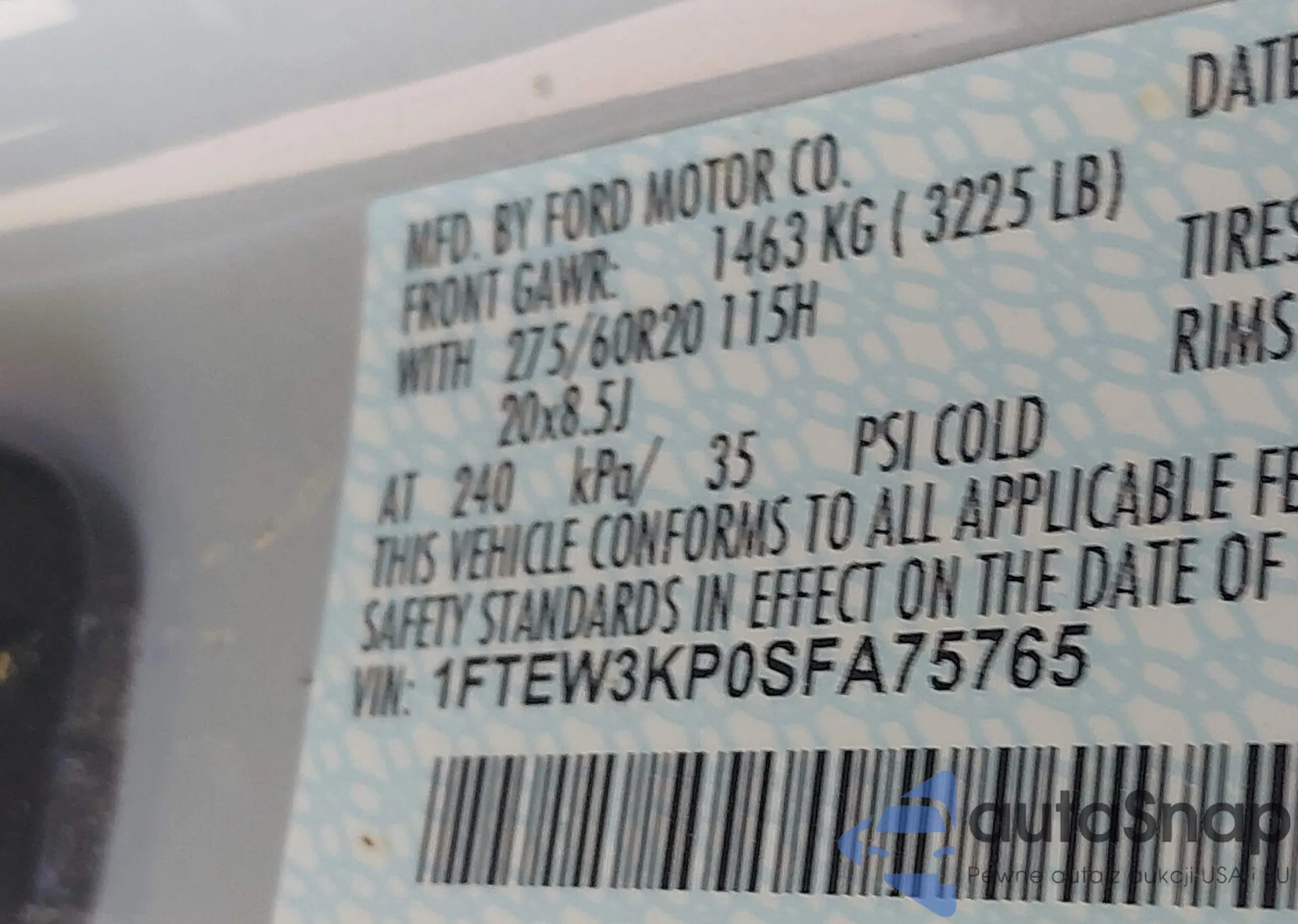 • VIN 1FTEW3KP0SFA75765