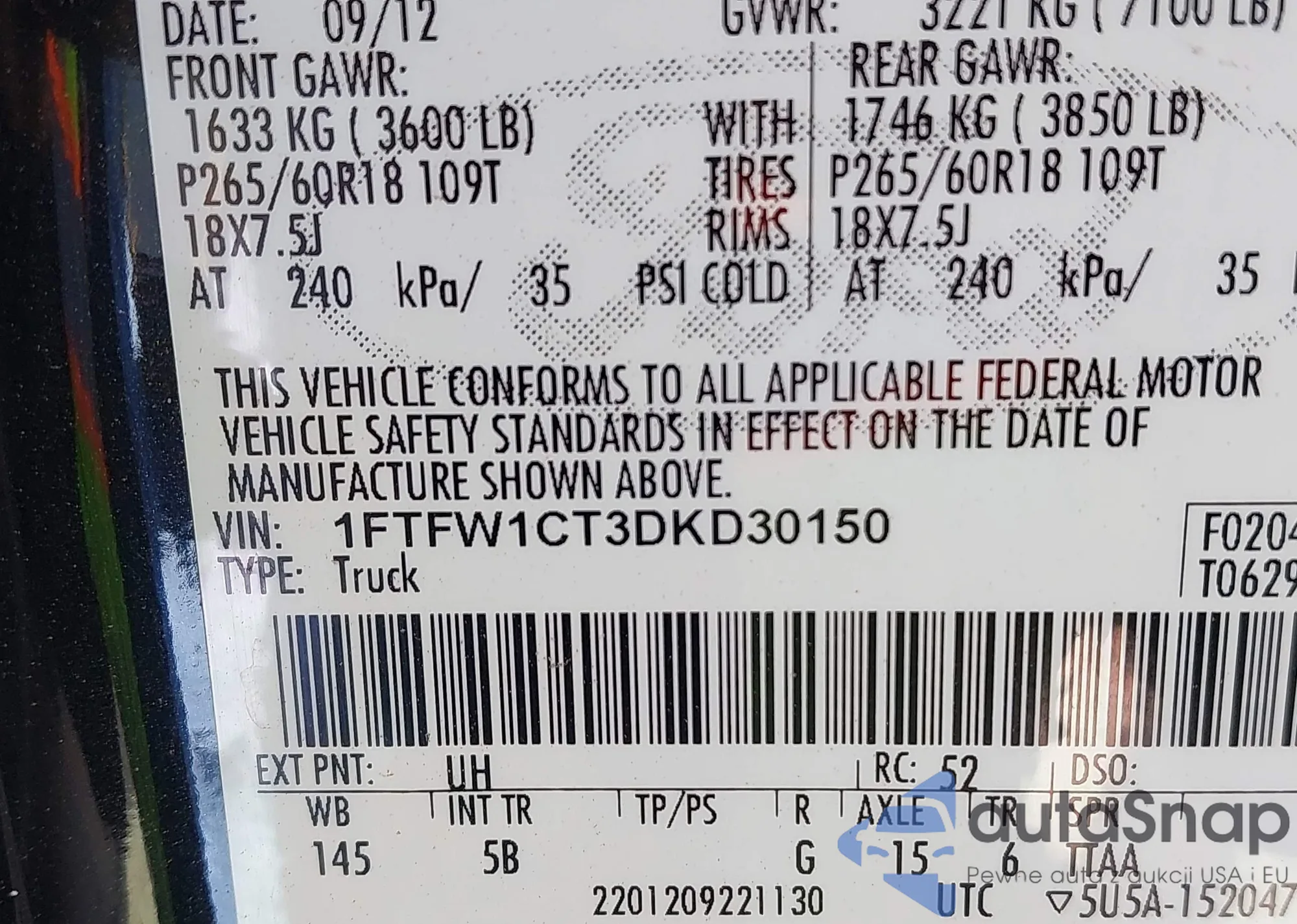 • VIN 1FTFW1CT3DKD30150