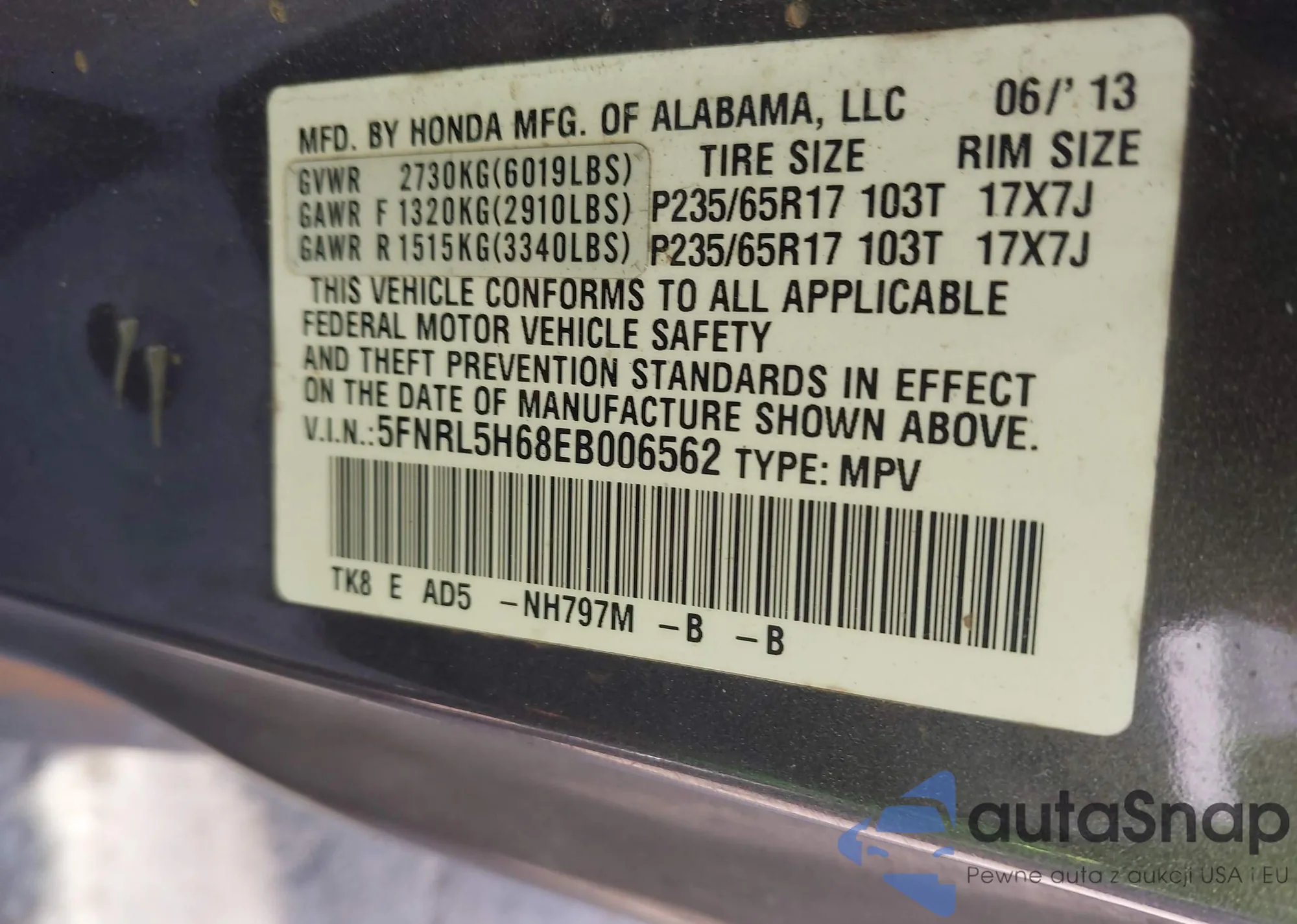 • VIN 5FNRL5H68EB006562