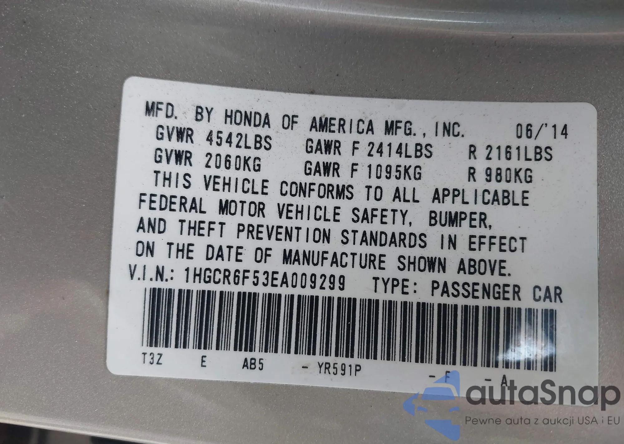 • VIN 1HGCR6F53EA009299