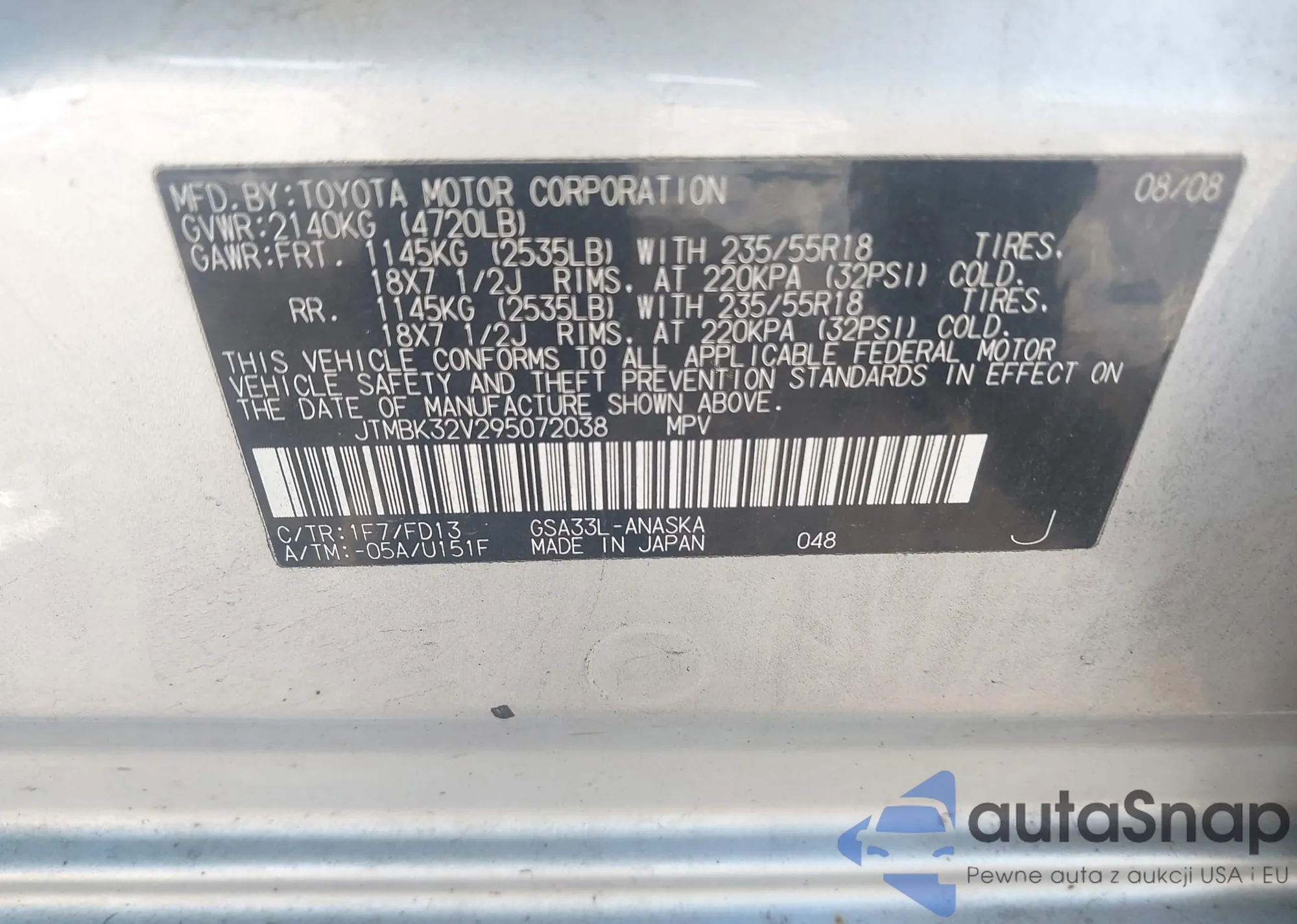 LOT: 43920653 VIN: 4T3BK3BB2DU088540