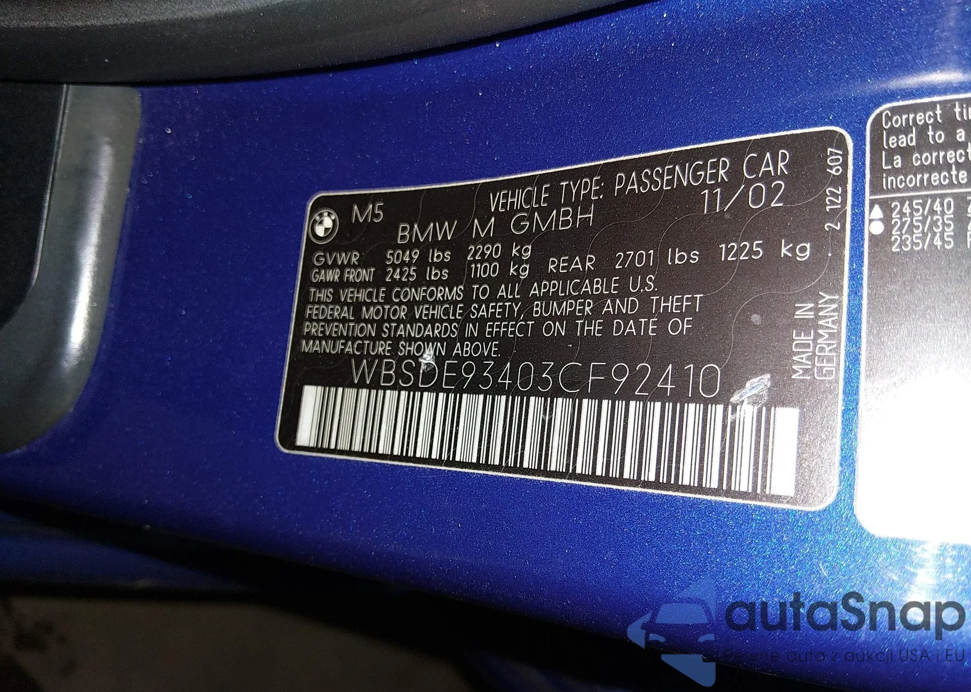2003 BMW M5 z USA, uszkodzony, nr VIN WBSDE93403CF92410