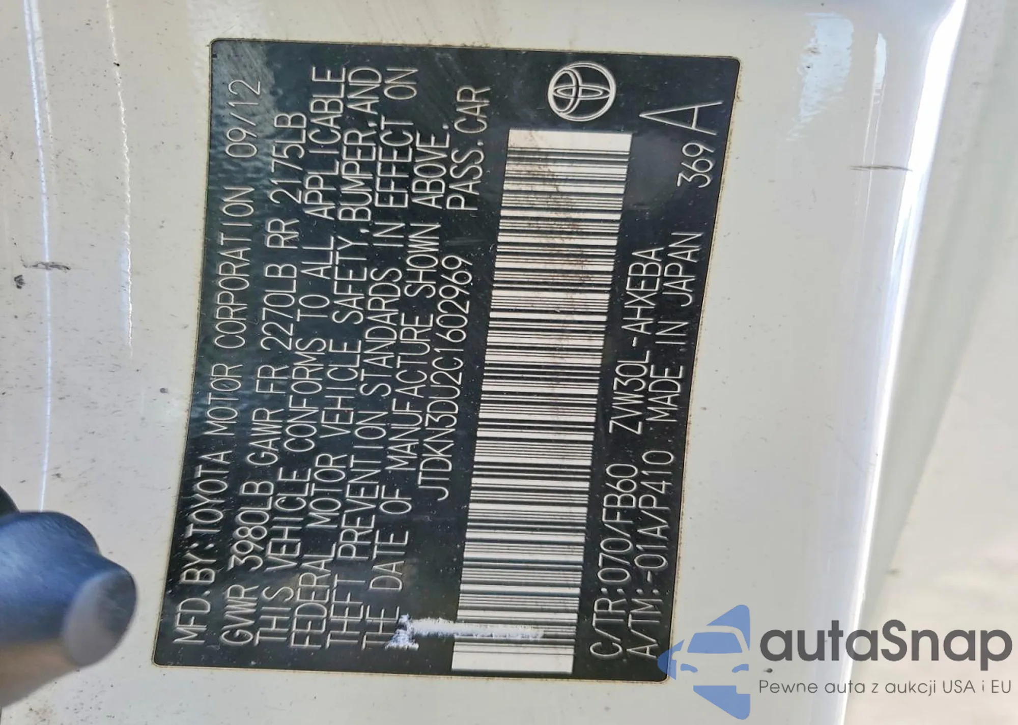 LOT: 74987645 VIN: JTDKN3DU2C1602969