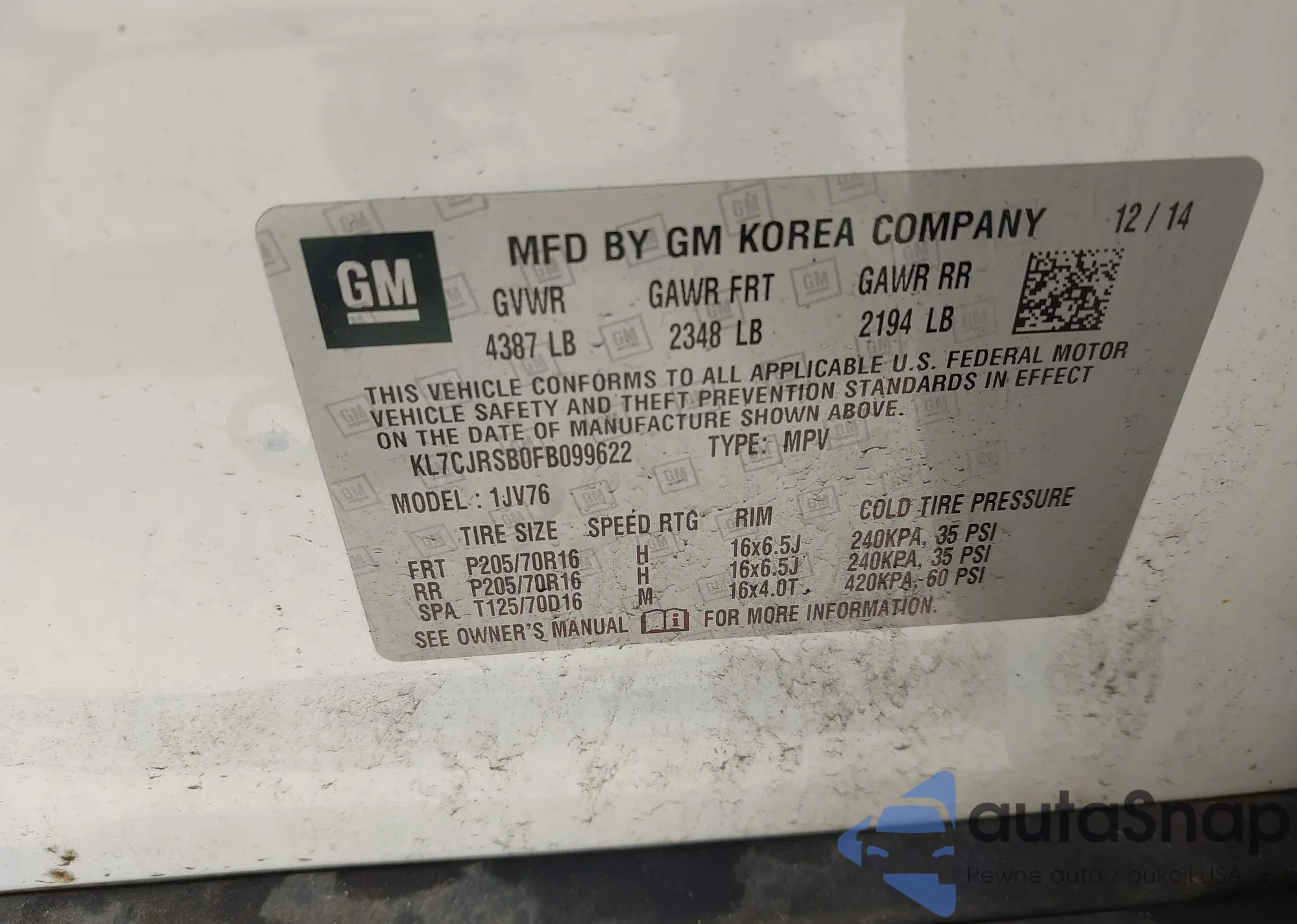 LOT: 43031033 VIN: KL7CJRSB0FB099622
