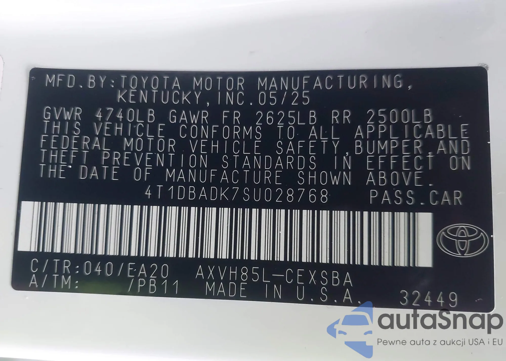 • VIN 4T1DBADK7SU028768
