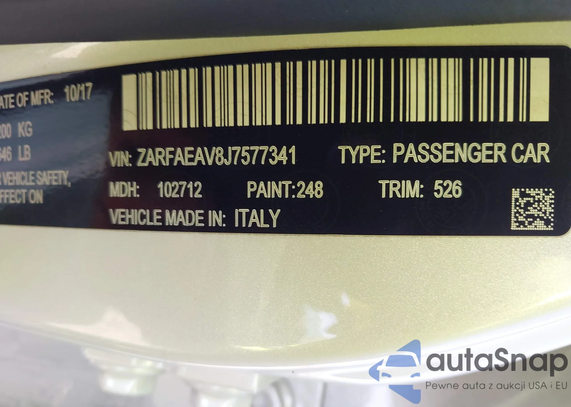 LOT: 43684720 VIN: ZARFAEAV8J7577341