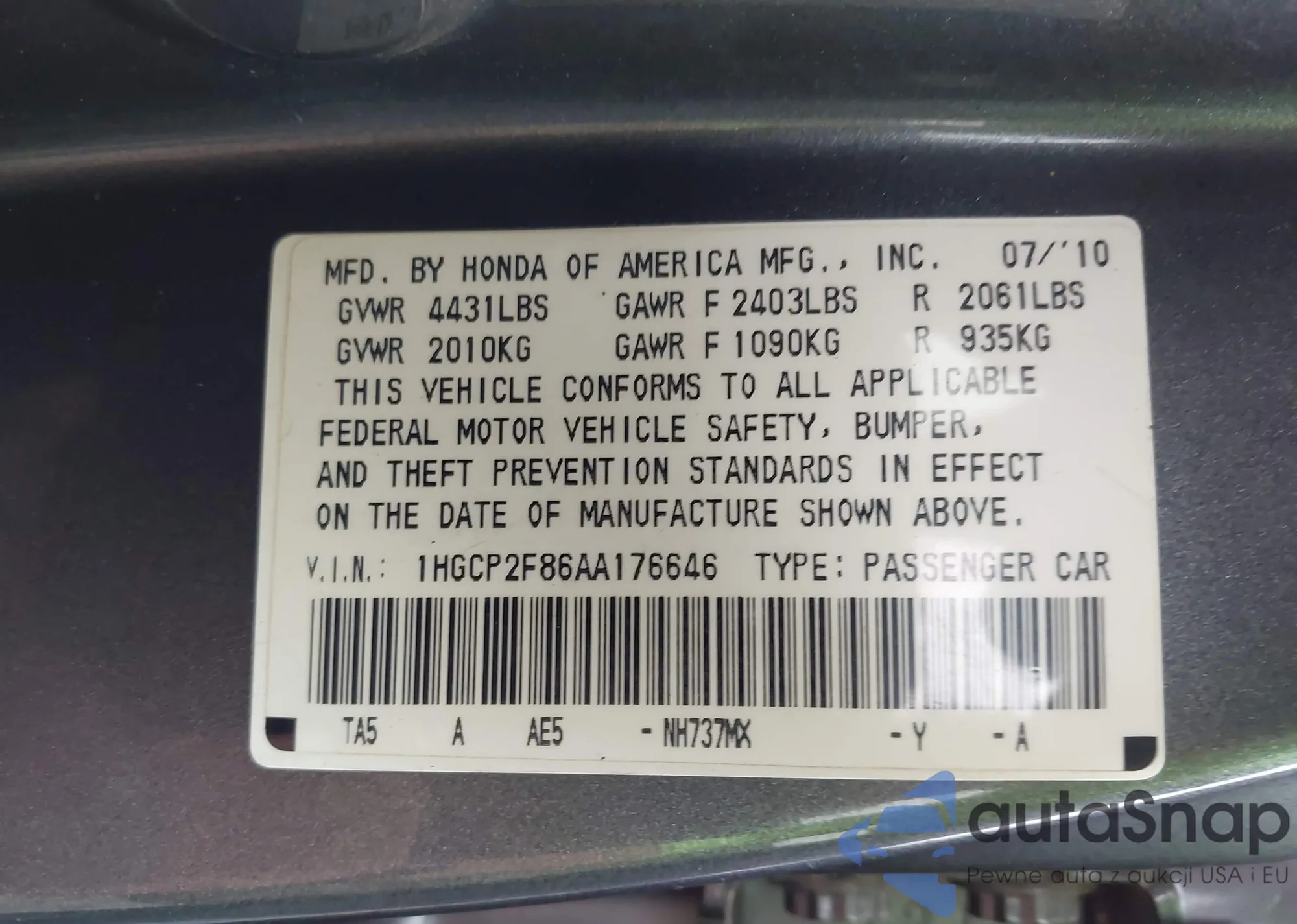 LOT: 44039976 VIN: 2HGFA16879H520653
