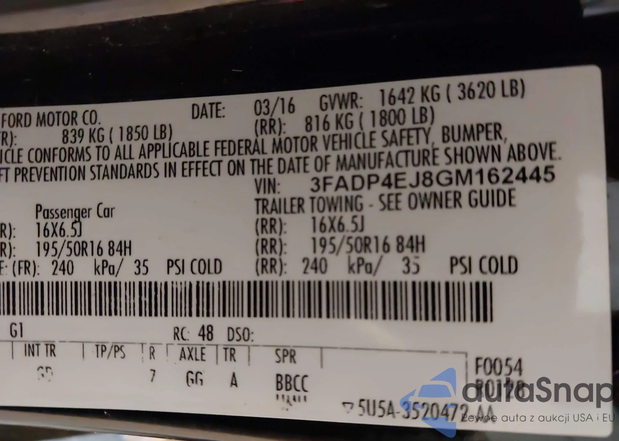 LOT: 43386931 VIN: 3FADP4EJ8GM162445