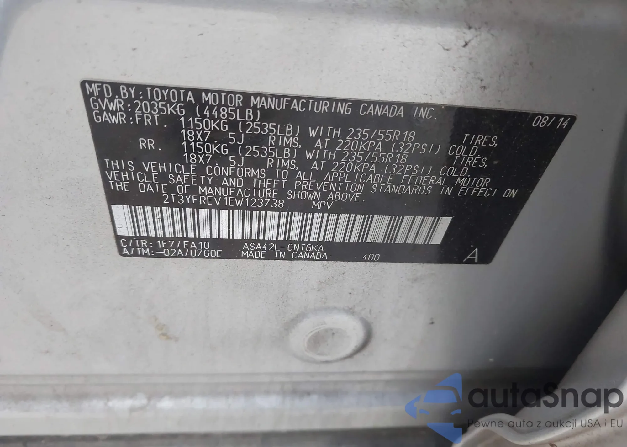 • VIN 2T3YFREV1EW123738