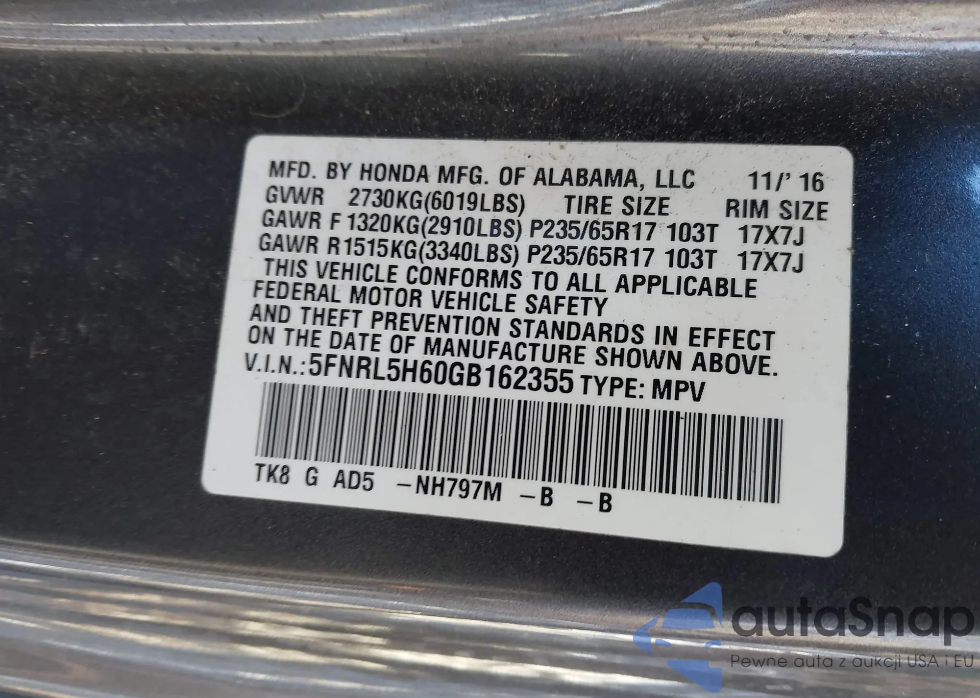 • VIN 5FNRL5H60GB162355