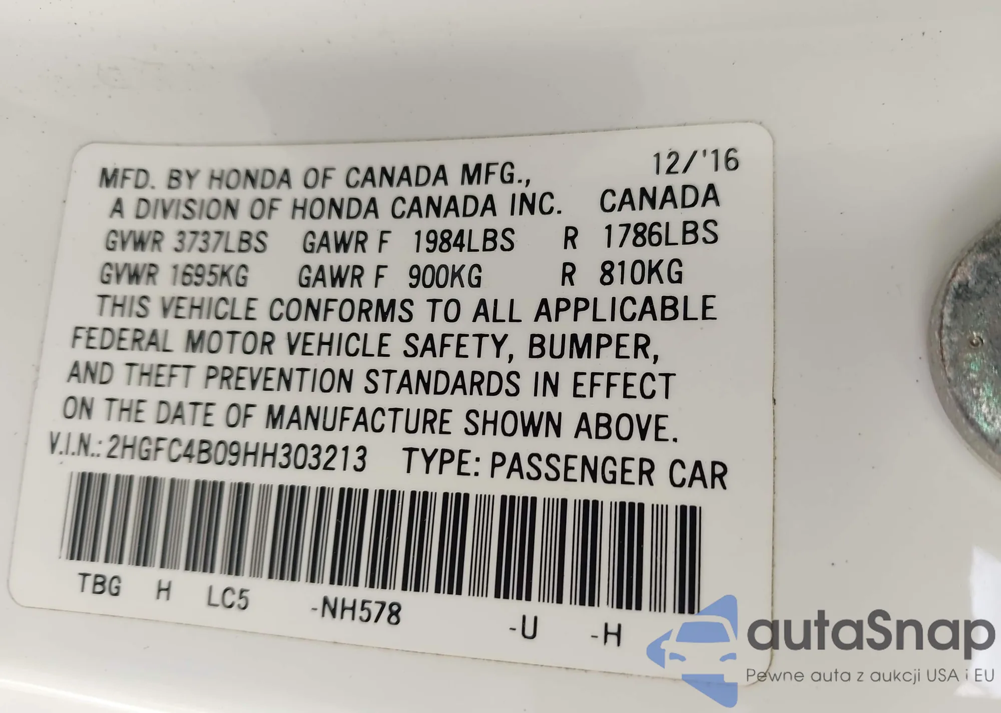 LOT: 43174295 VIN: 2HGFC4B09HH303213