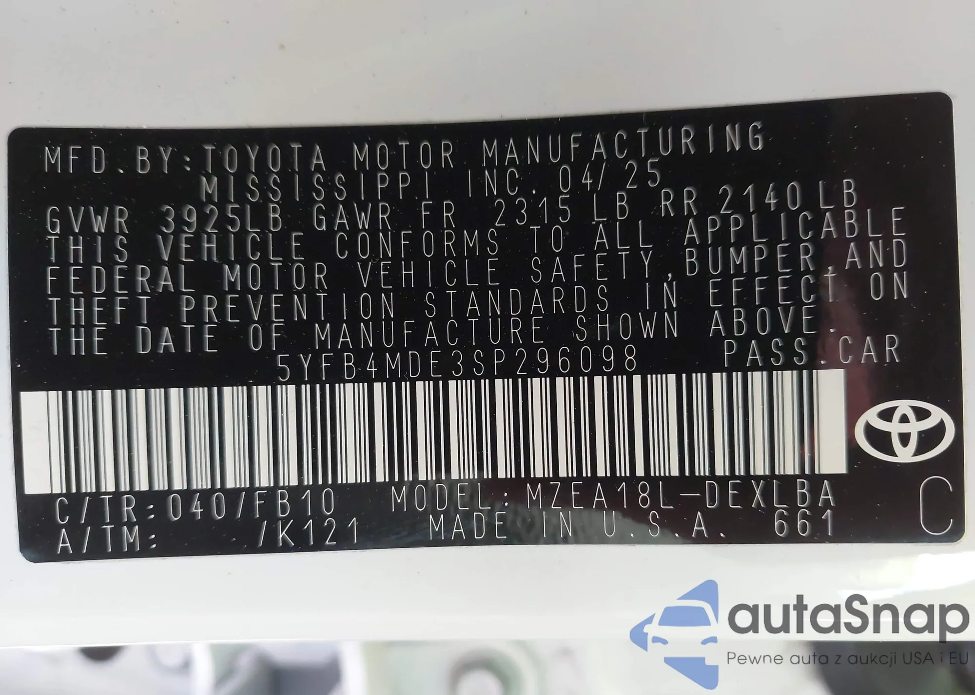 • VIN 5YFB4MDE3SP296098