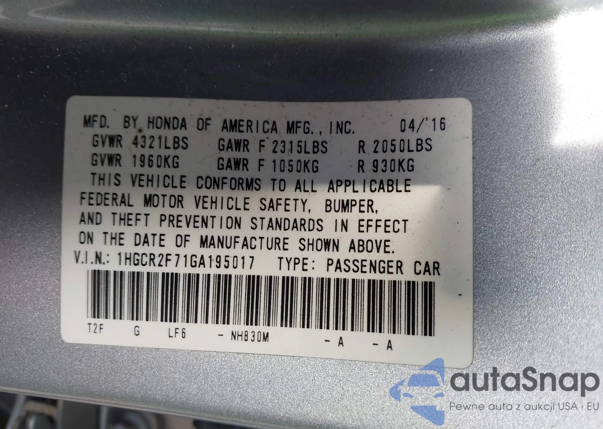 • VIN SHHFK7H49MU405879