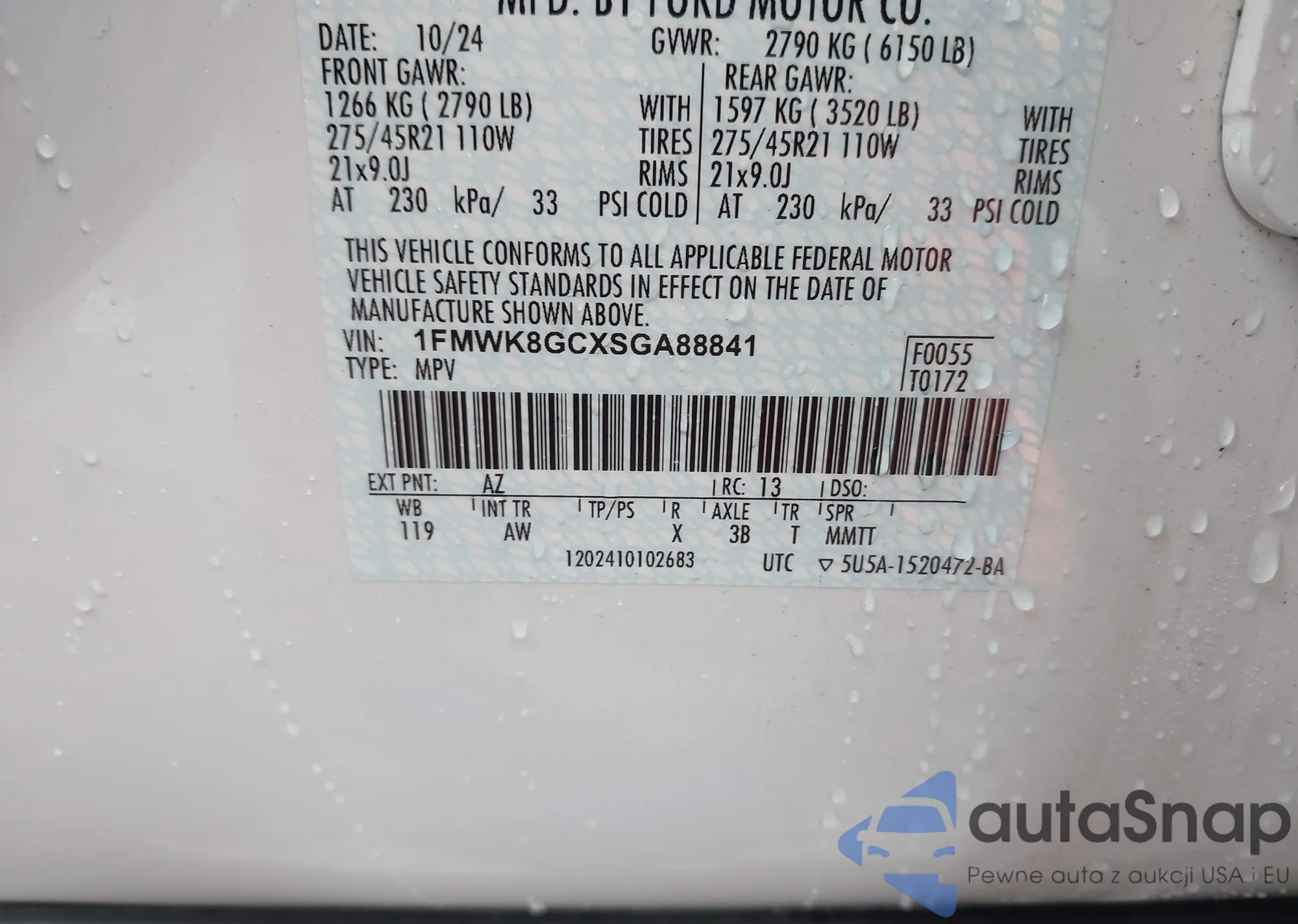 • VIN 1FMWK8GCXSGA88841