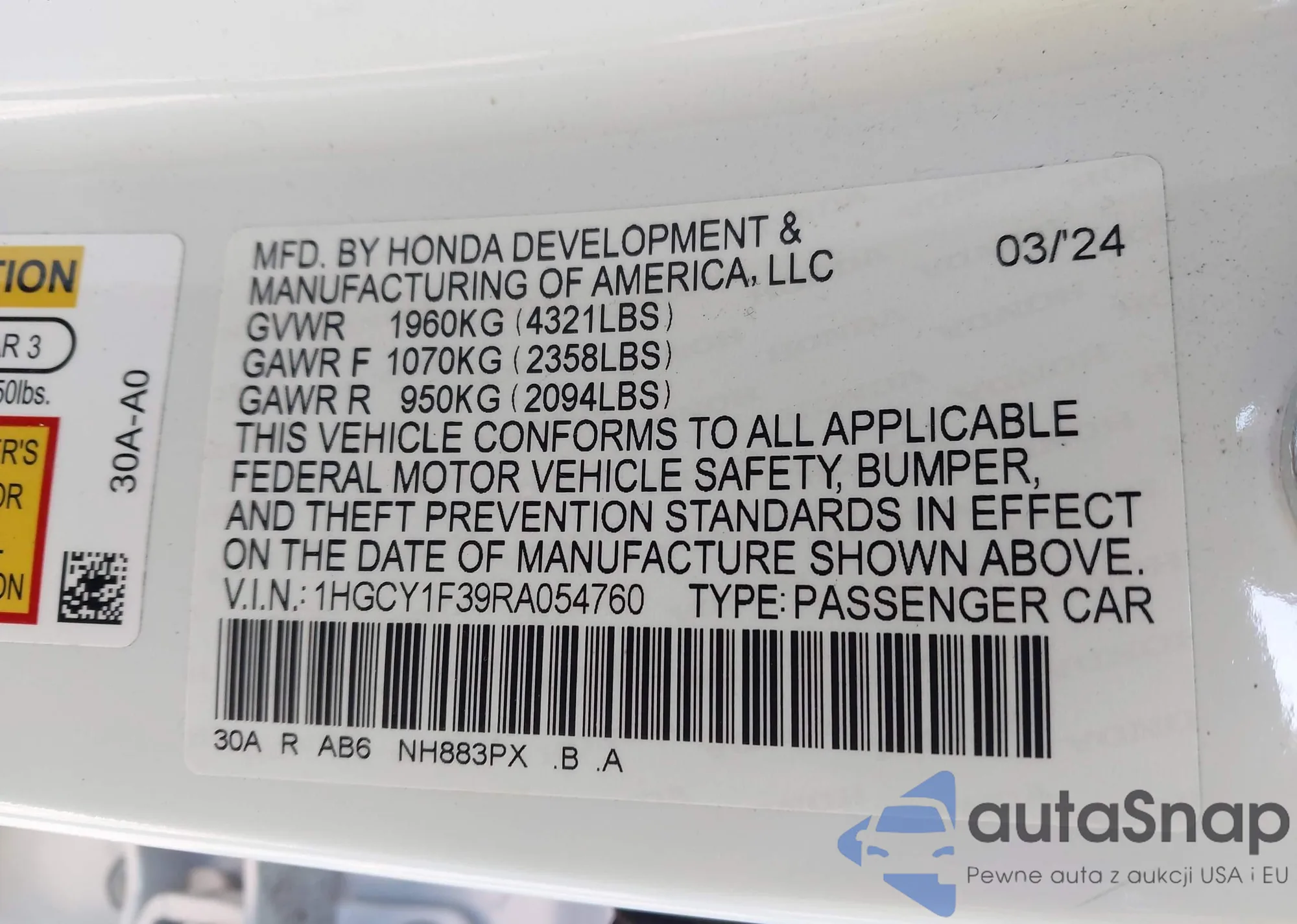 LOT: 43985142 VIN: 1HGCY1F39RA054760