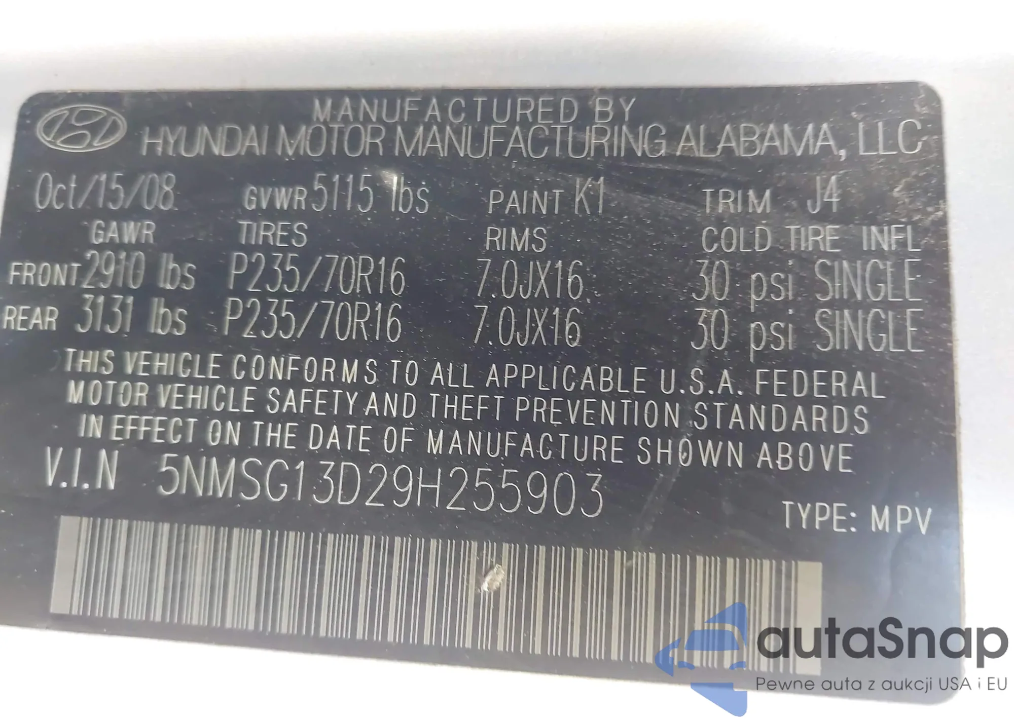 LOT: 44043686 VIN: 5NMSG13D29H255903