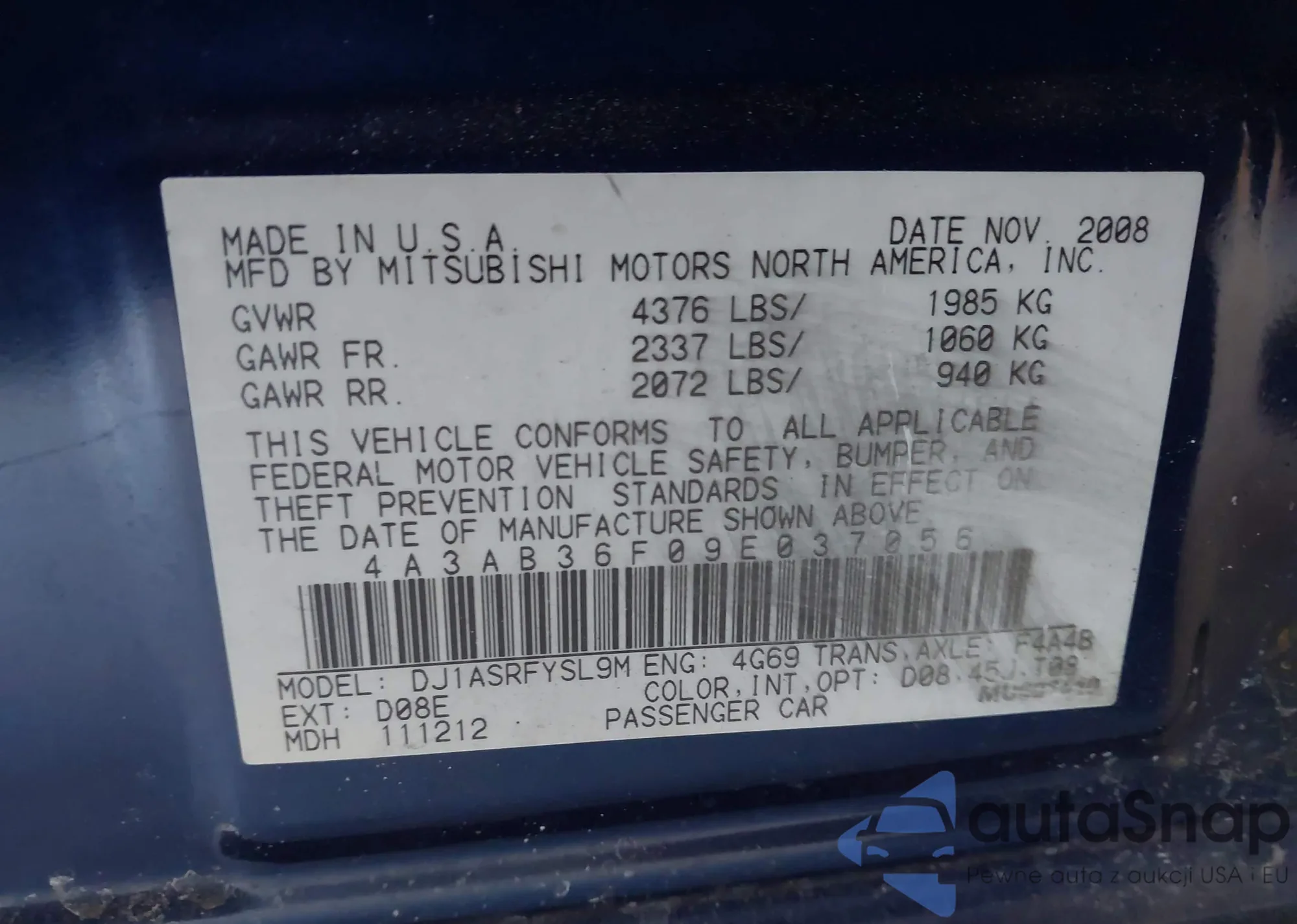 LOT: 44231797 VIN: 4A3AB36F09E037056
