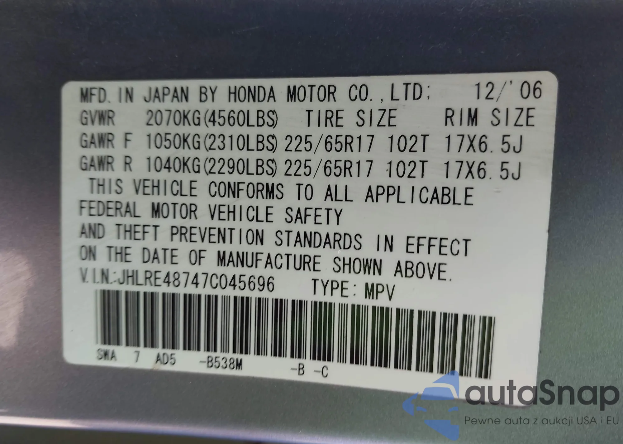 LOT: 44289065 VIN: JHLRE48747C045696