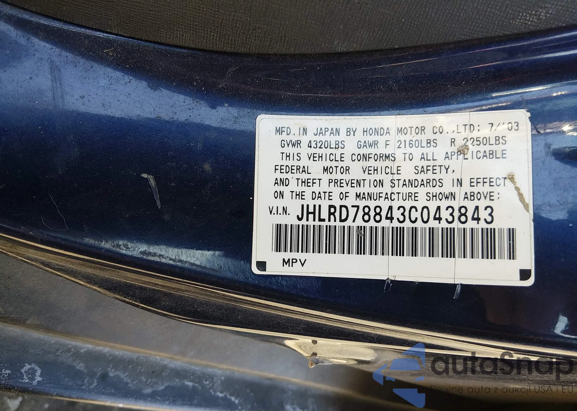 • VIN JHLRD78843C043843