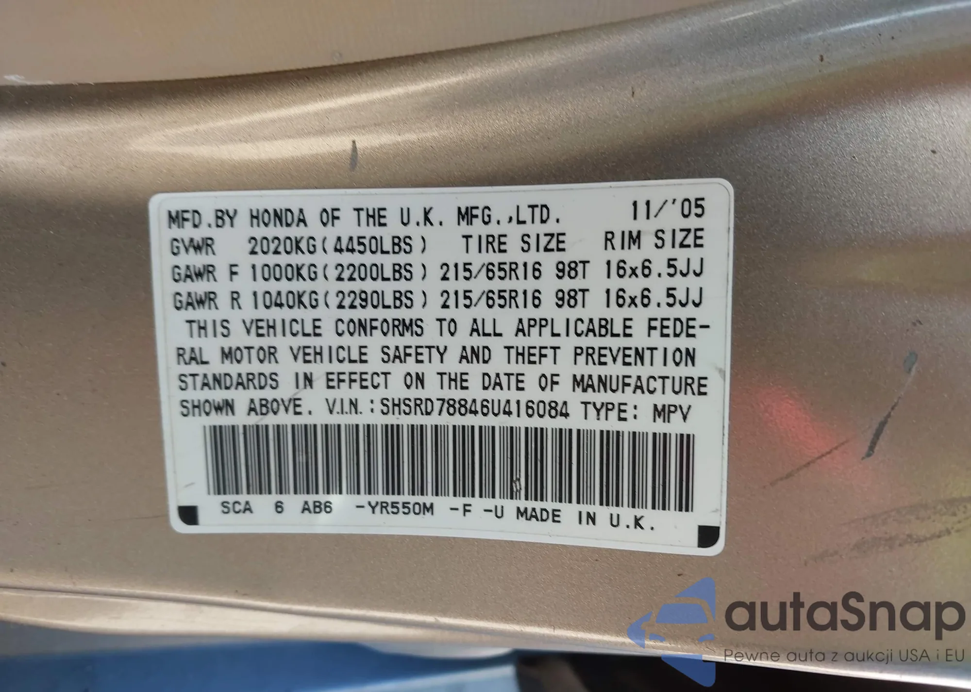 LOT: 44352896 VIN: SHSRD78846U416084