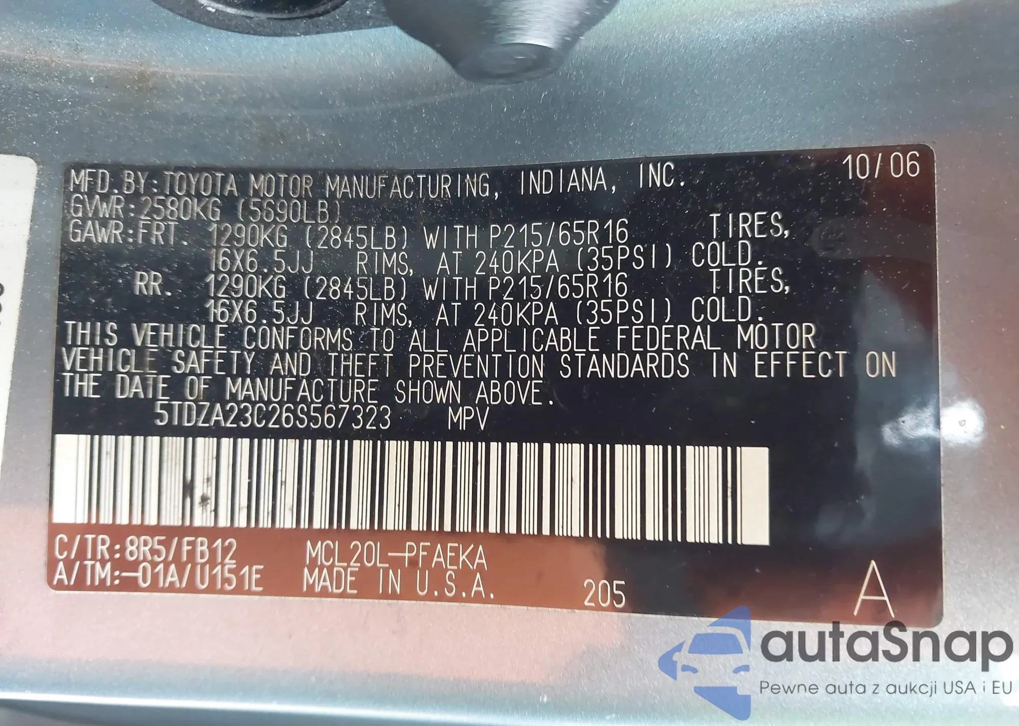 LOT: 44085307 VIN: 5TDZA23C26S567323
