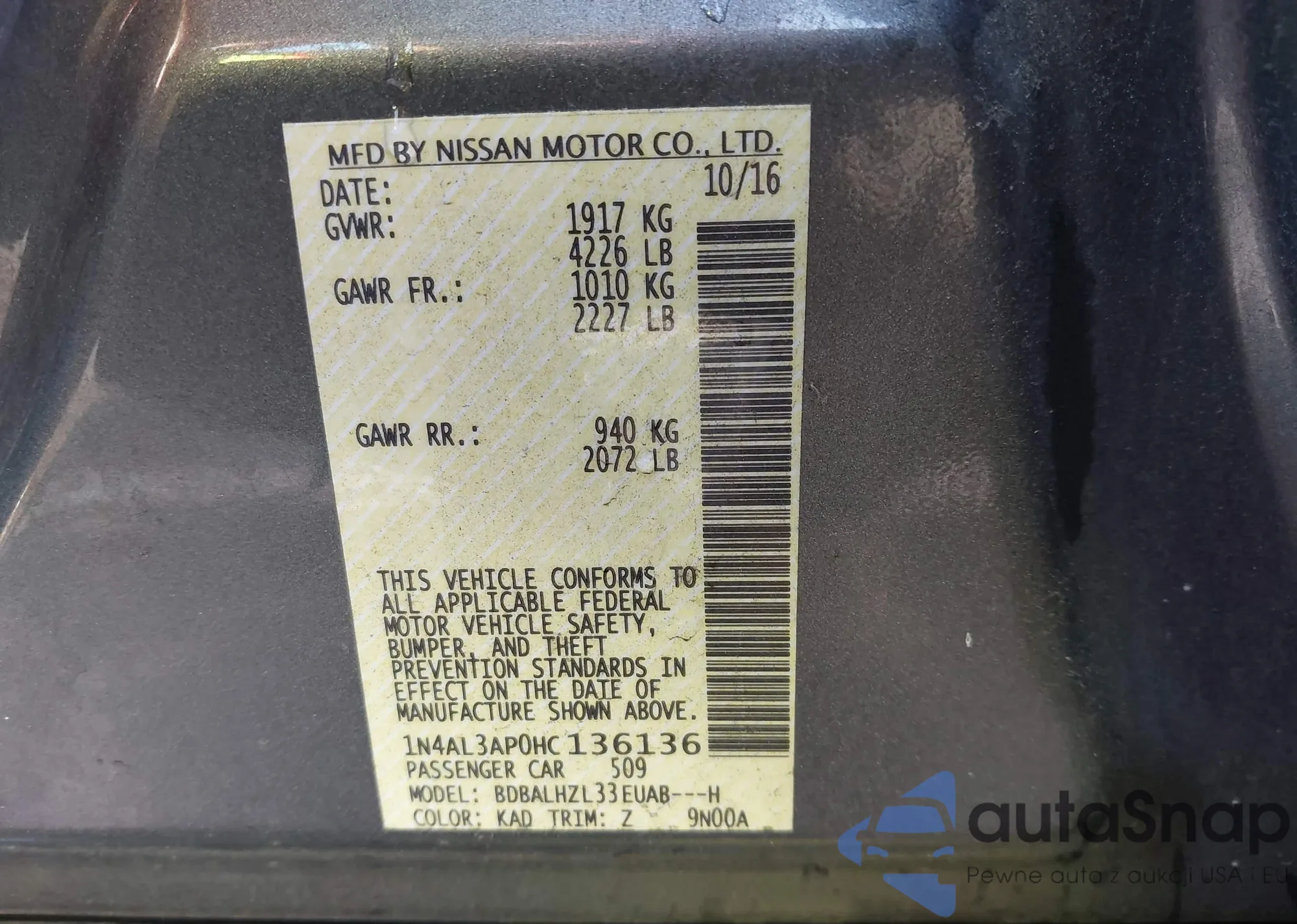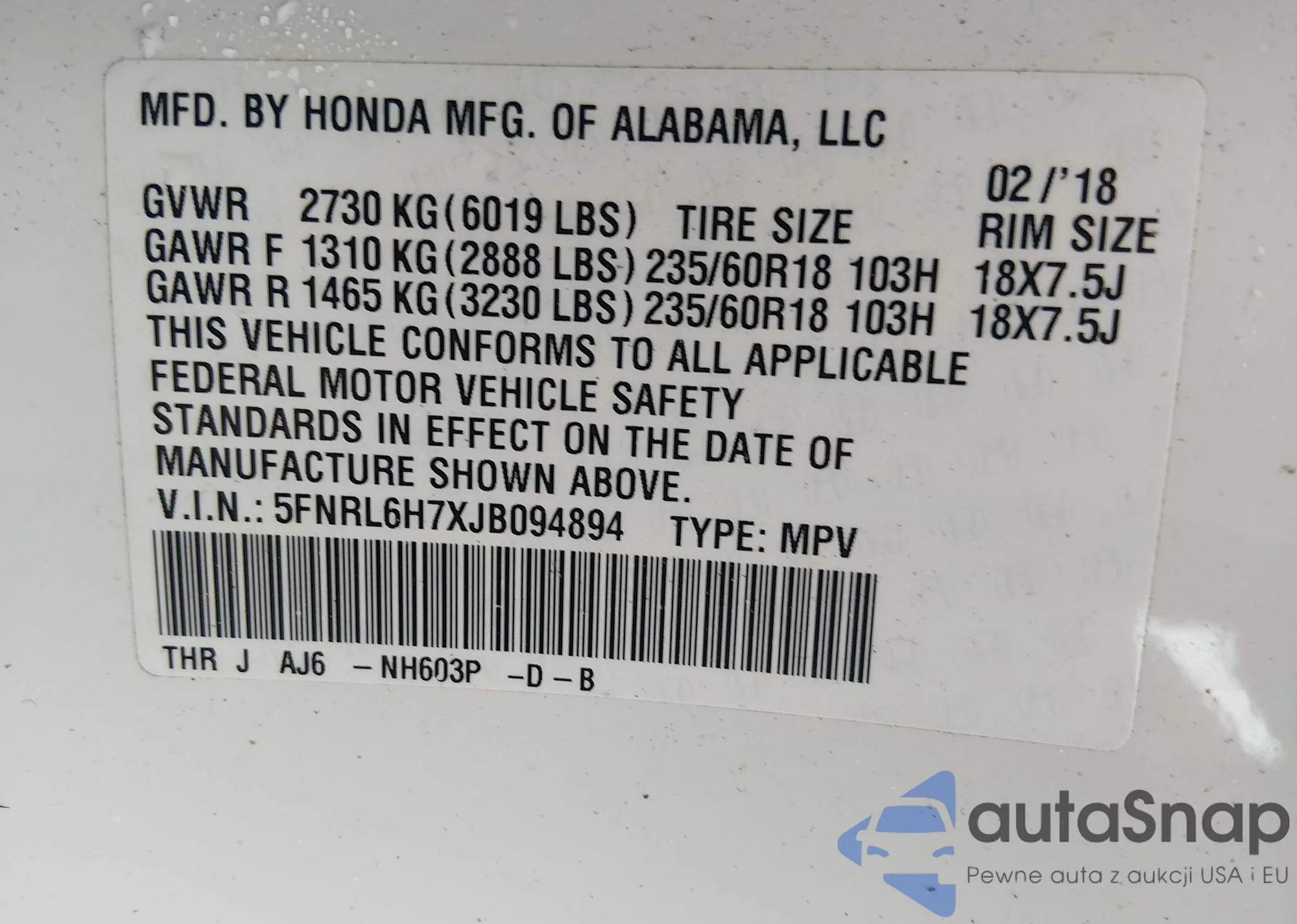 • VIN 5FNRL6H7XJB094894