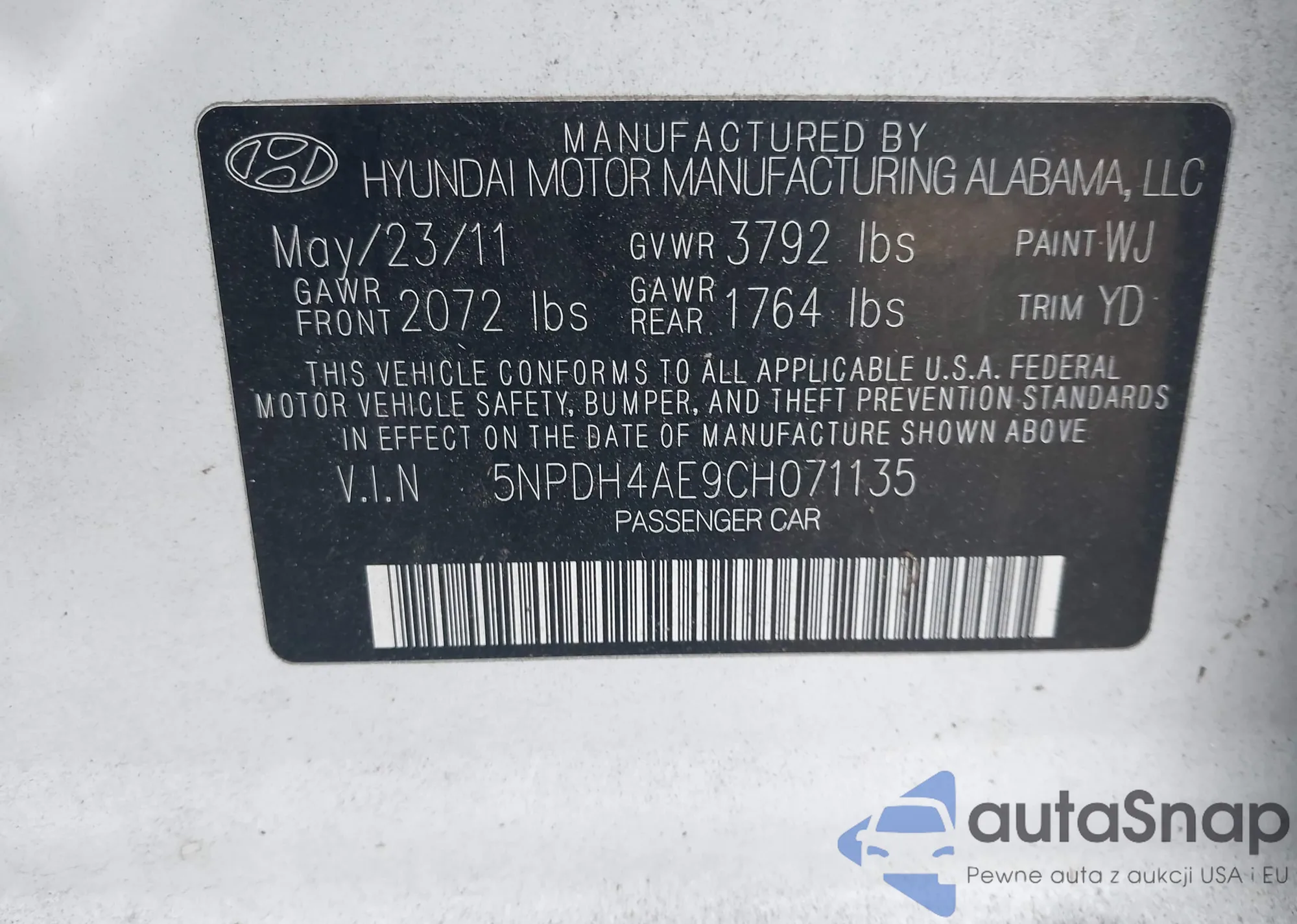 LOT: 44235444 VIN: 5NPDH4AE9CH071135