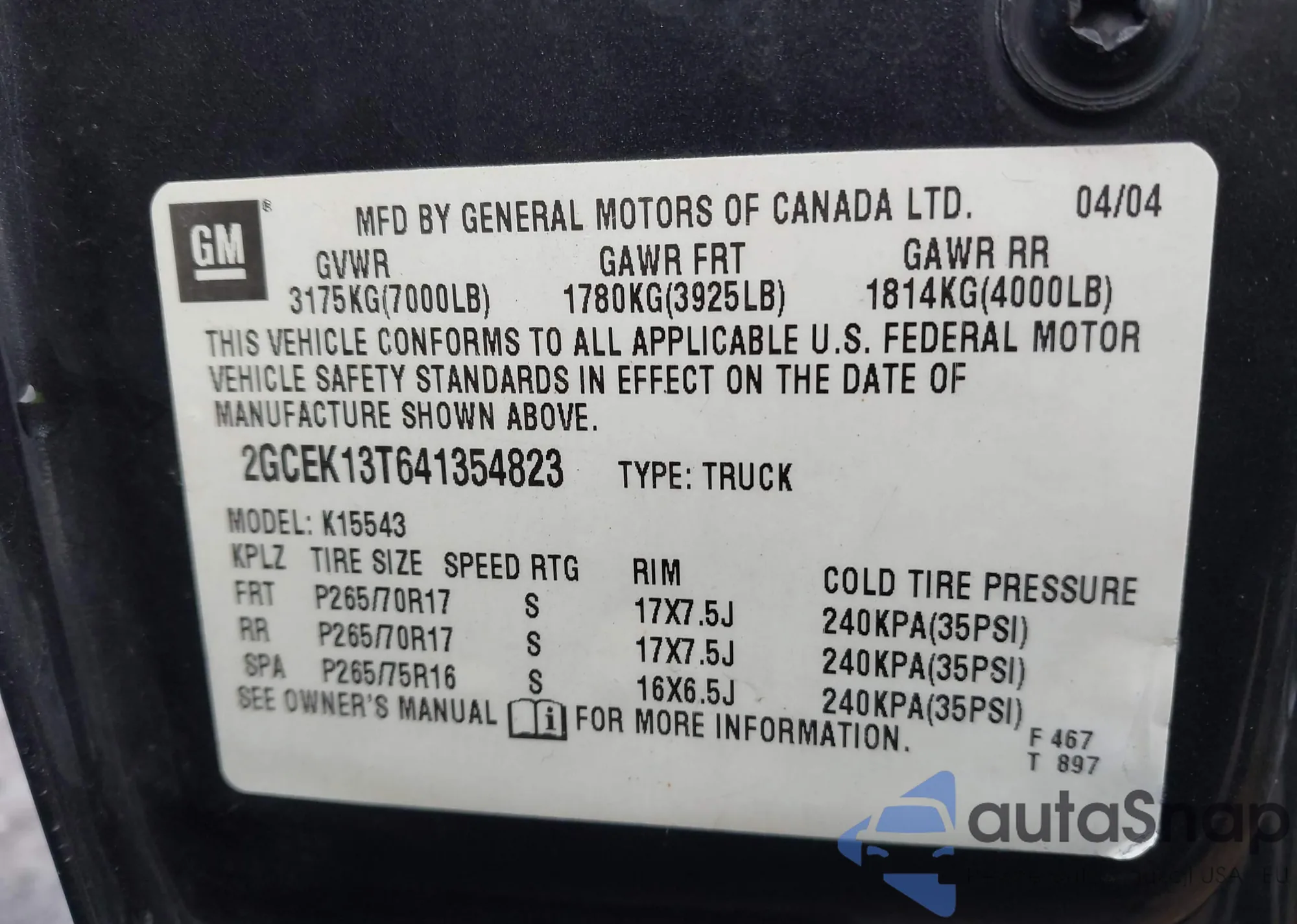 • VIN 2GCEK13T641354823