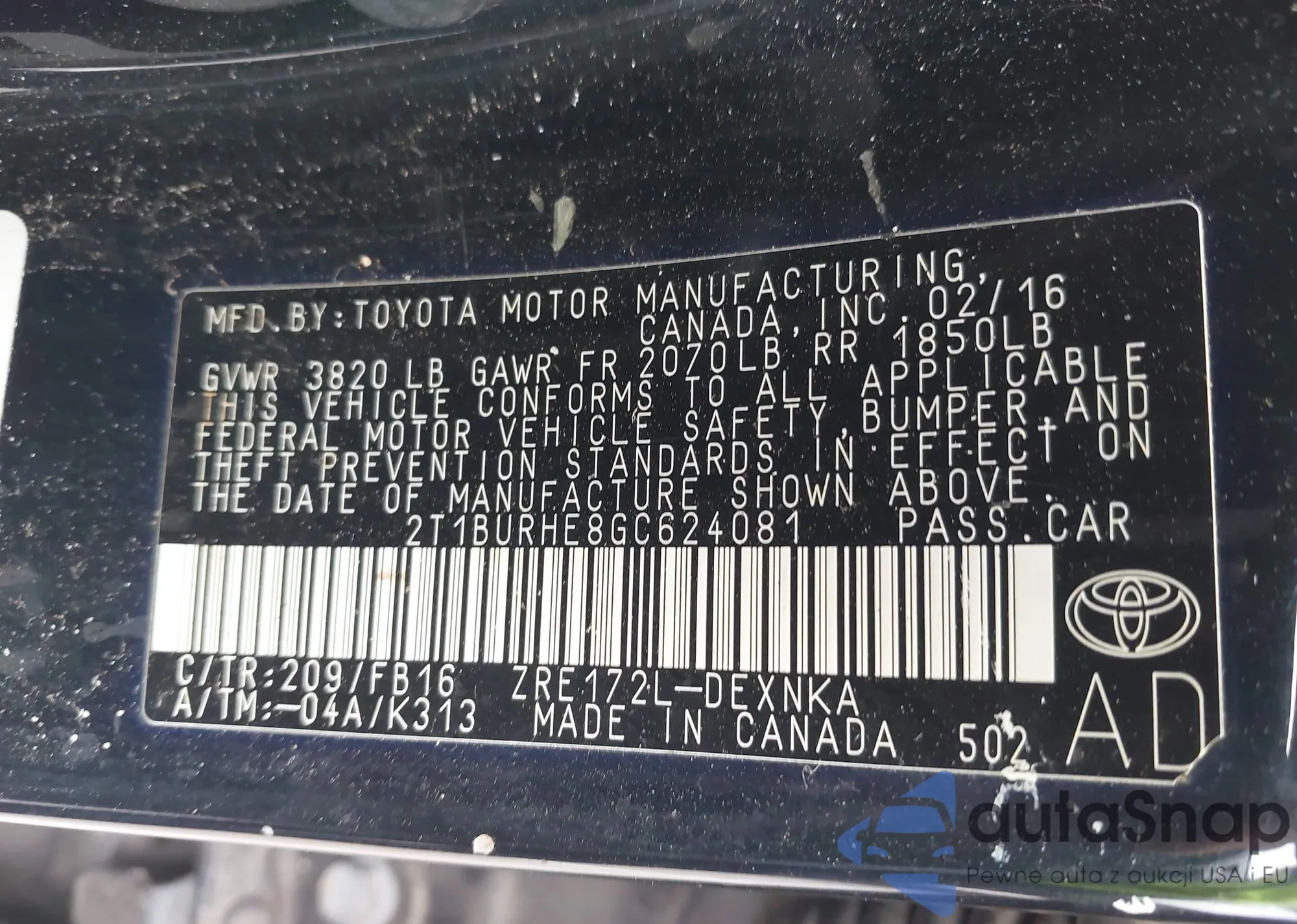 LOT: 43406821 VIN: 2T1BURHE8GC624081