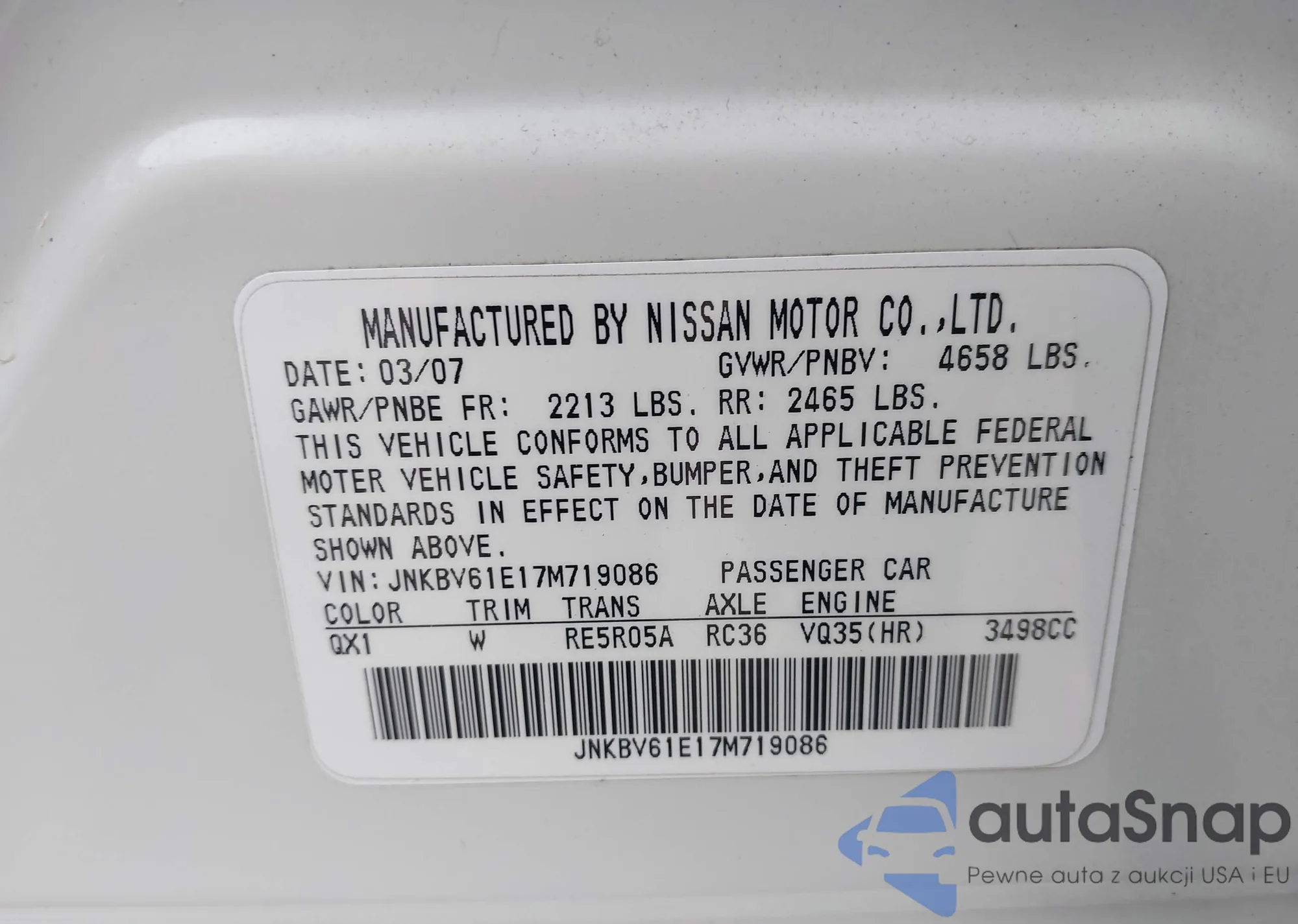 2007 Infiniti G35 Sport z USA, uszkodzony, nr VIN JNKBV61E17M719086