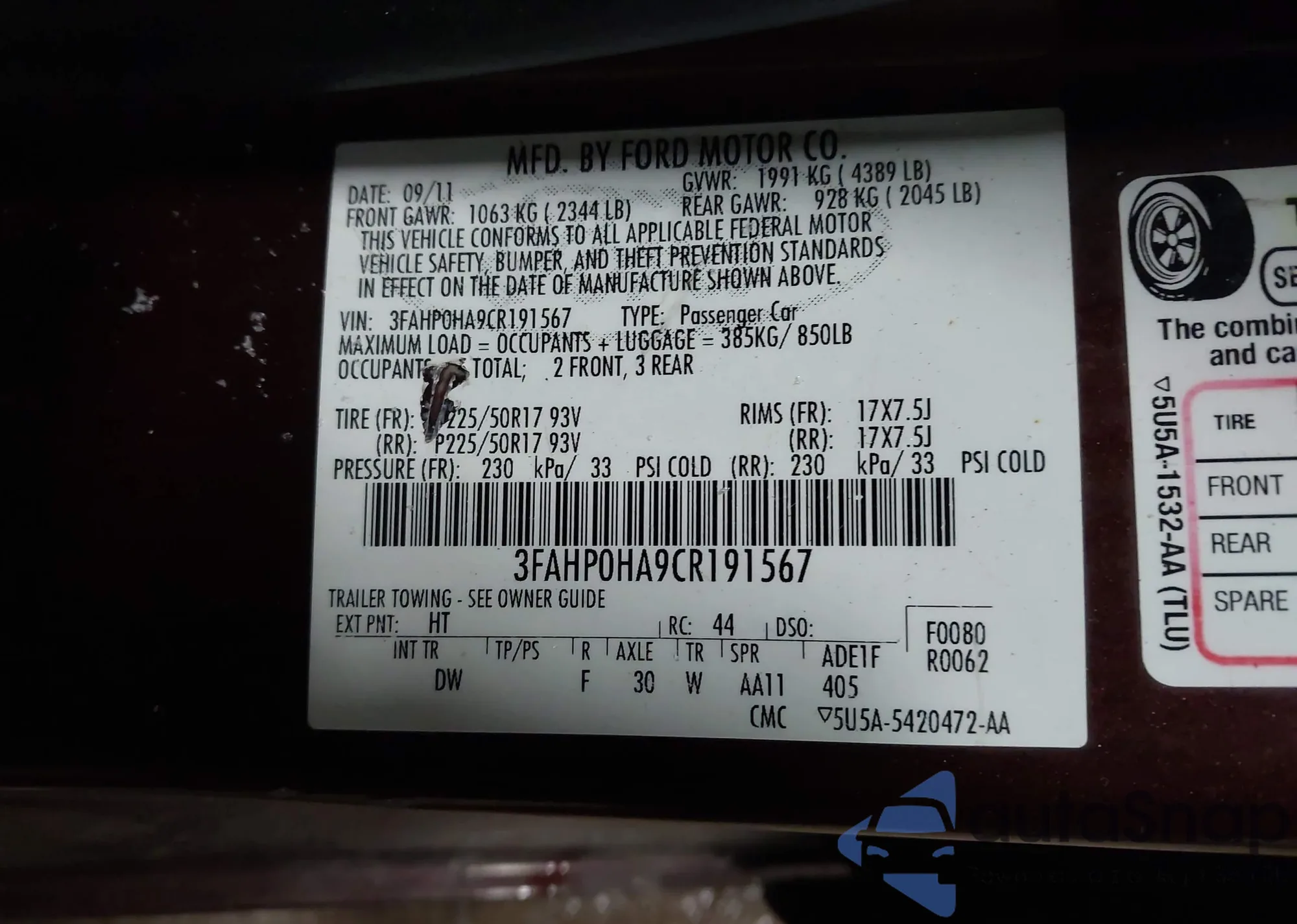 • VIN 3FAHP0HA9CR191567