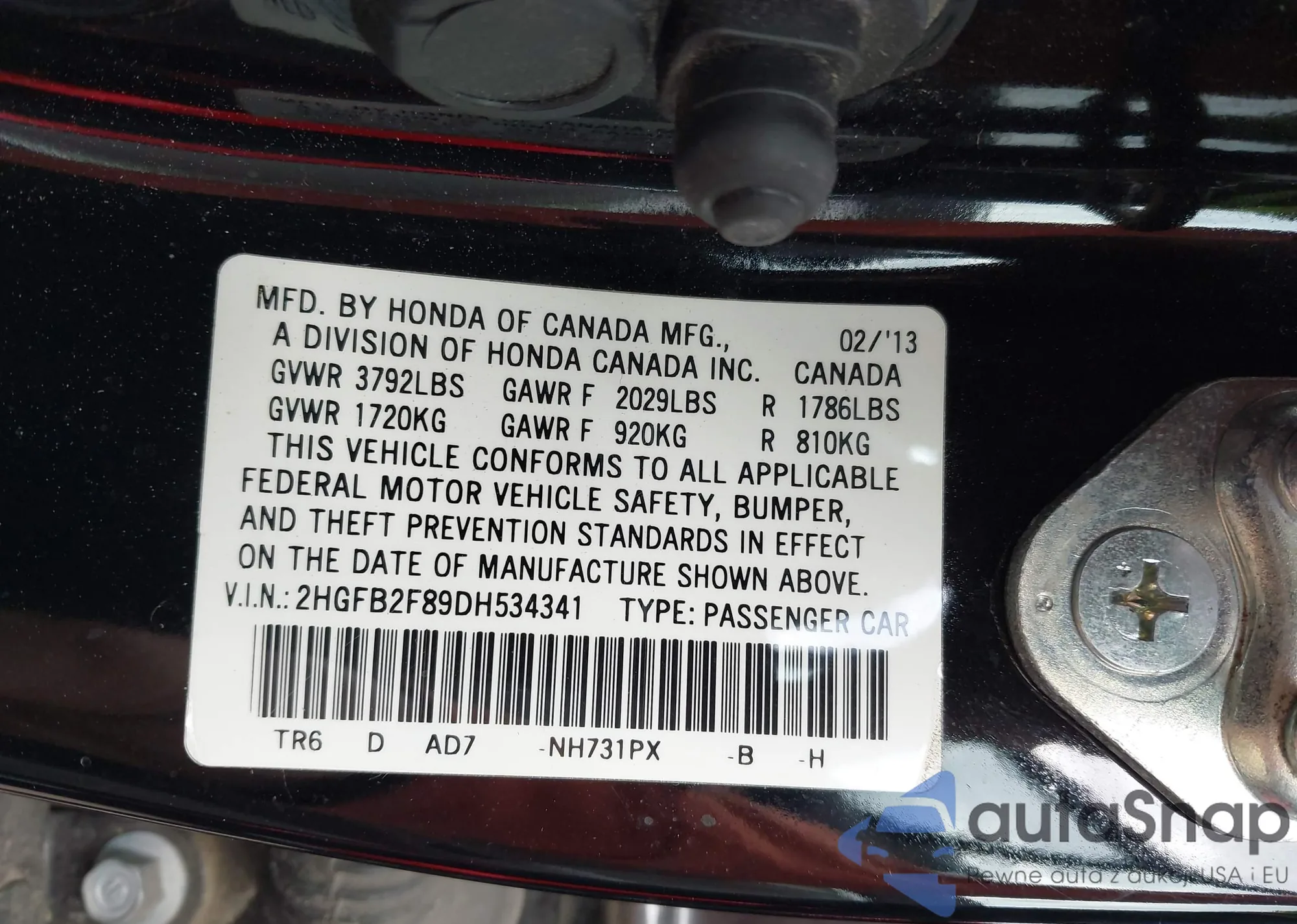 LOT: 44209721 VIN: 2HGFB2F89DH534341