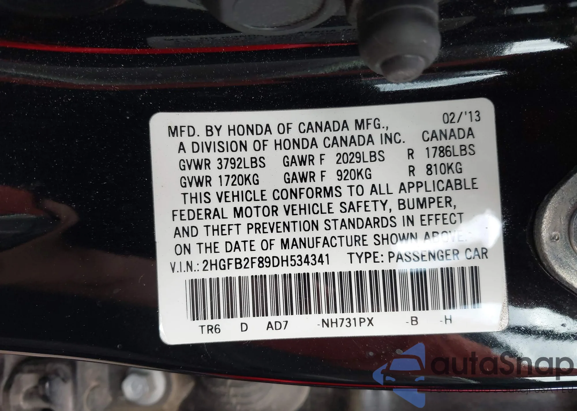 • VIN 2HGFB2F89DH534341