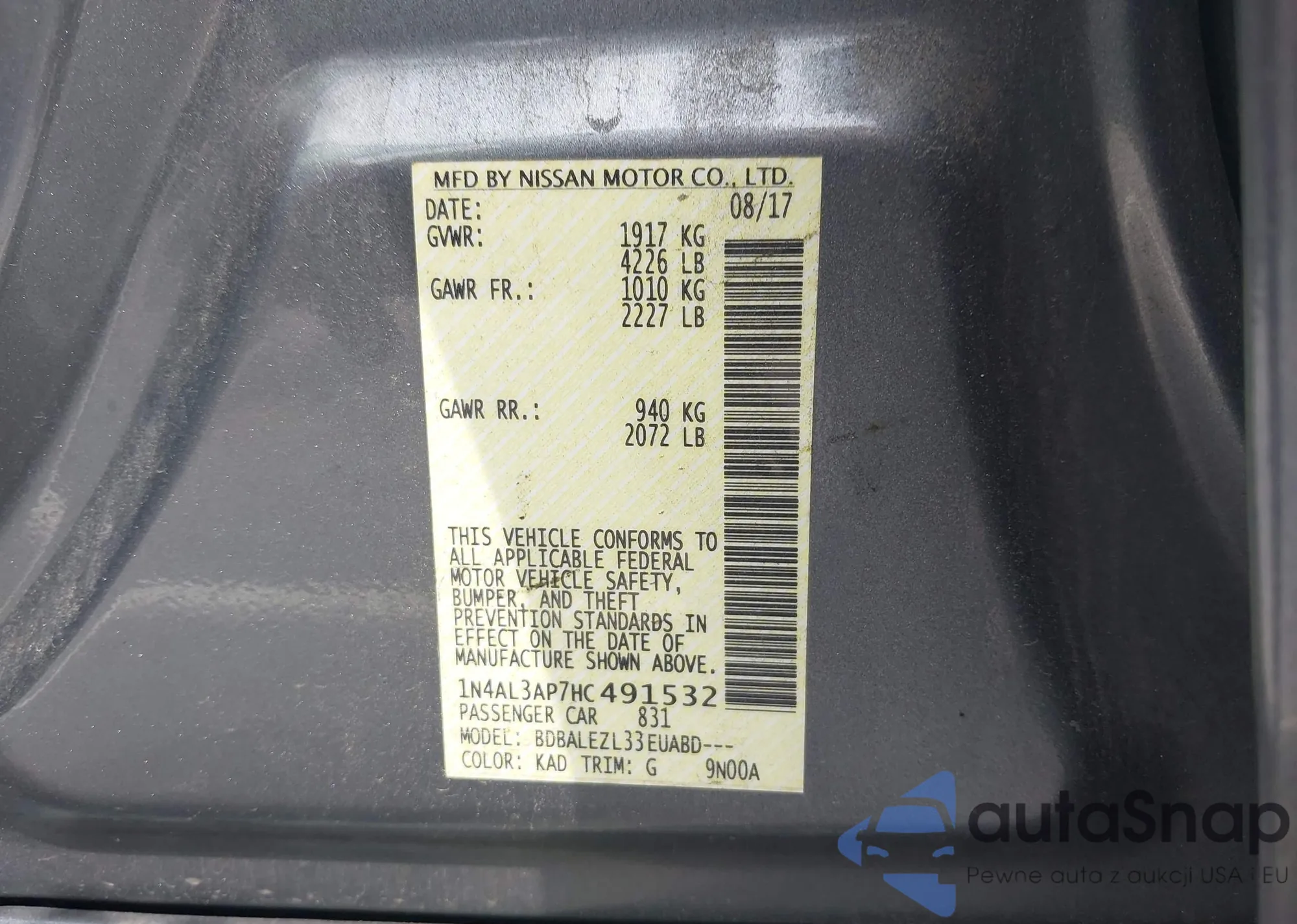 • VIN 1N4AL3AP7HC491532