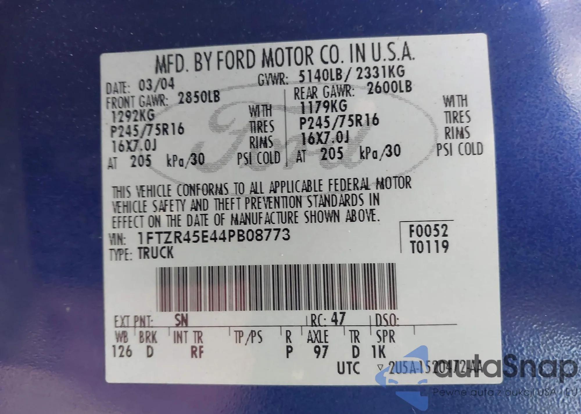LOT: 43511031 VIN: 1FTZR45E44PB08773