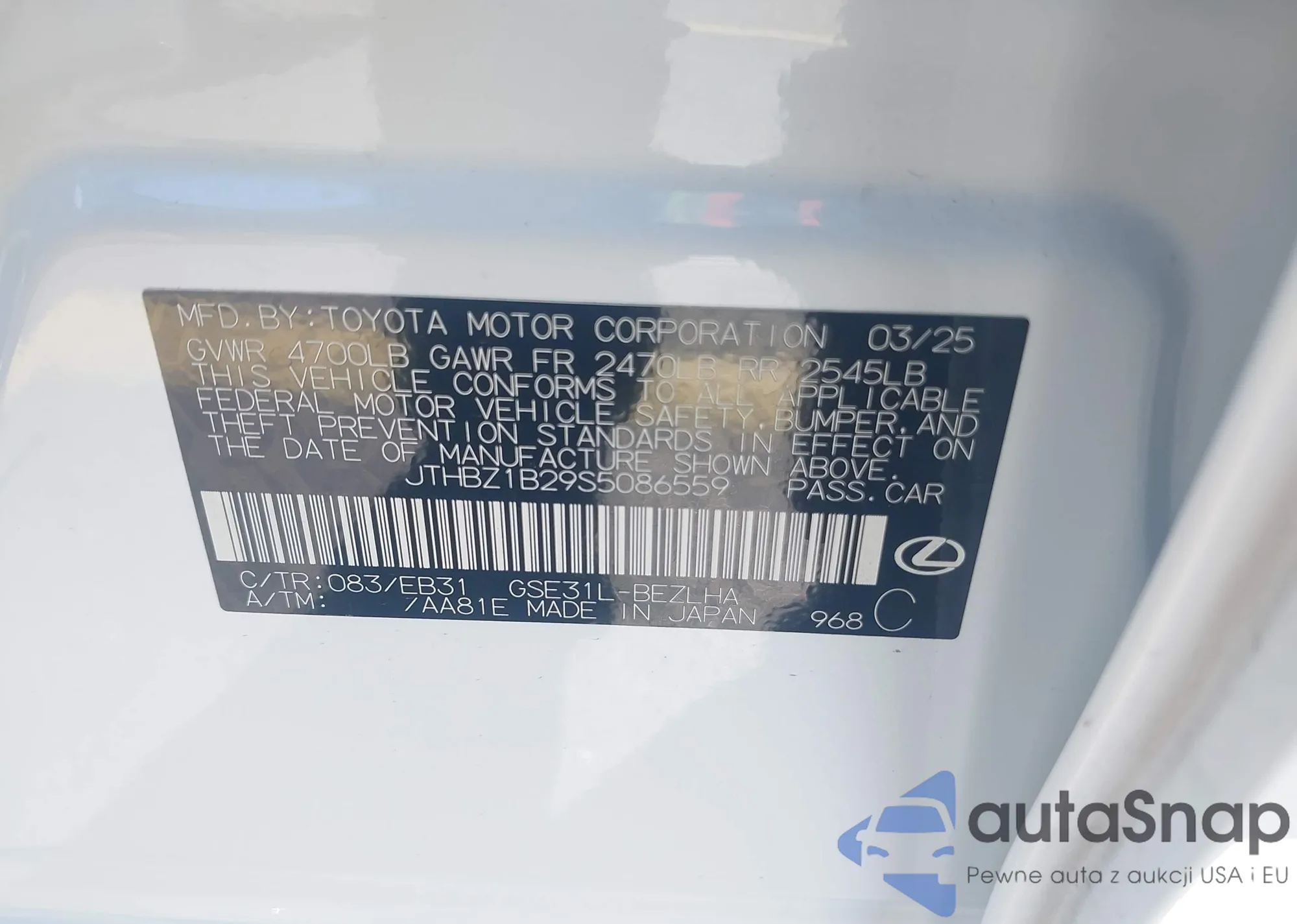 LOT: 43654291 VIN: JTHBZ1B29S5086559