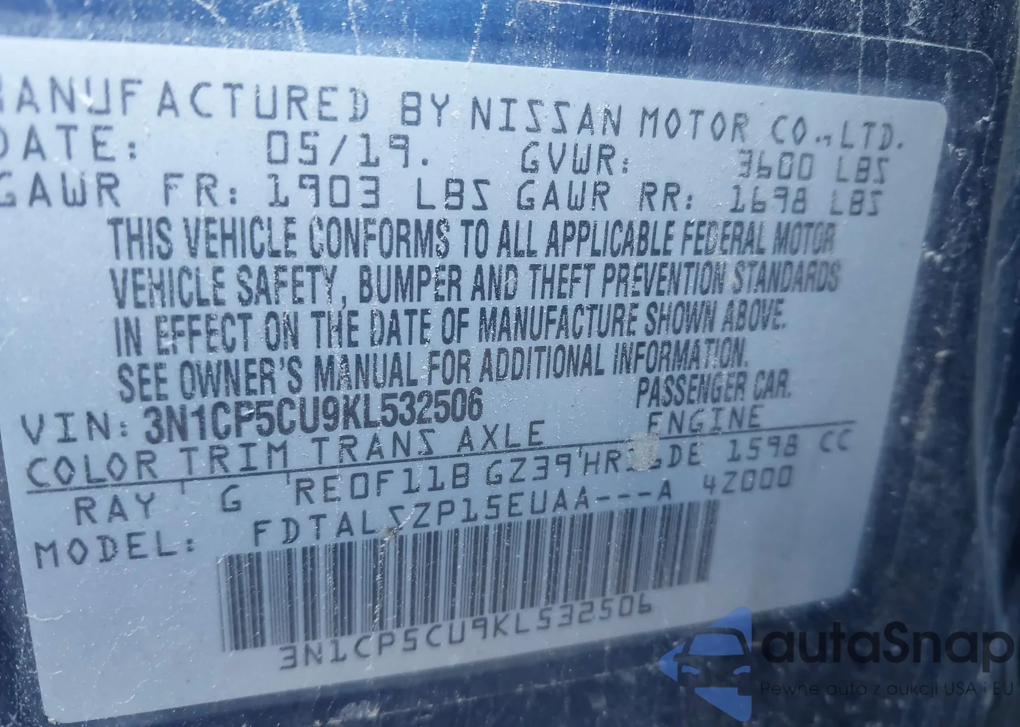 LOT: 43630372 VIN: SHHFK7H41KU206354