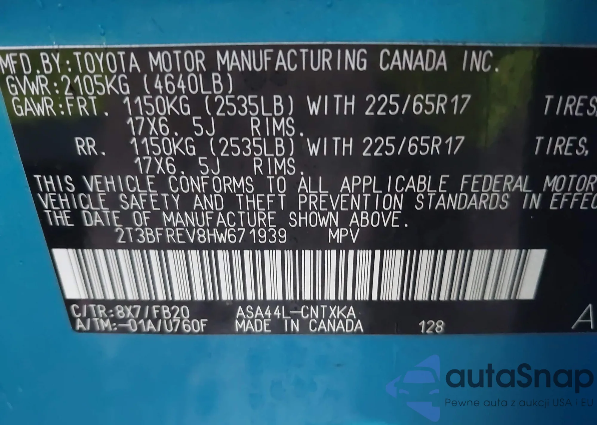 • VIN 2T3BFREV8HW671939