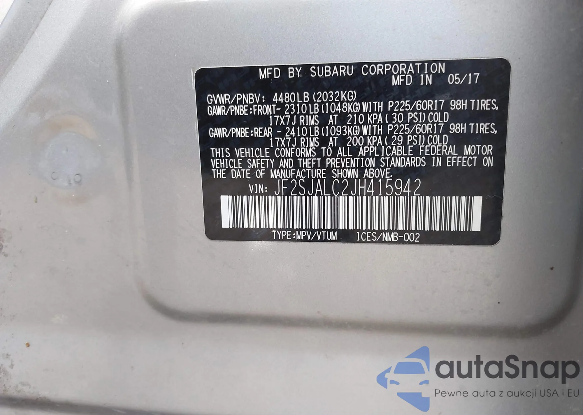 • VIN JF2SJALC2JH415942