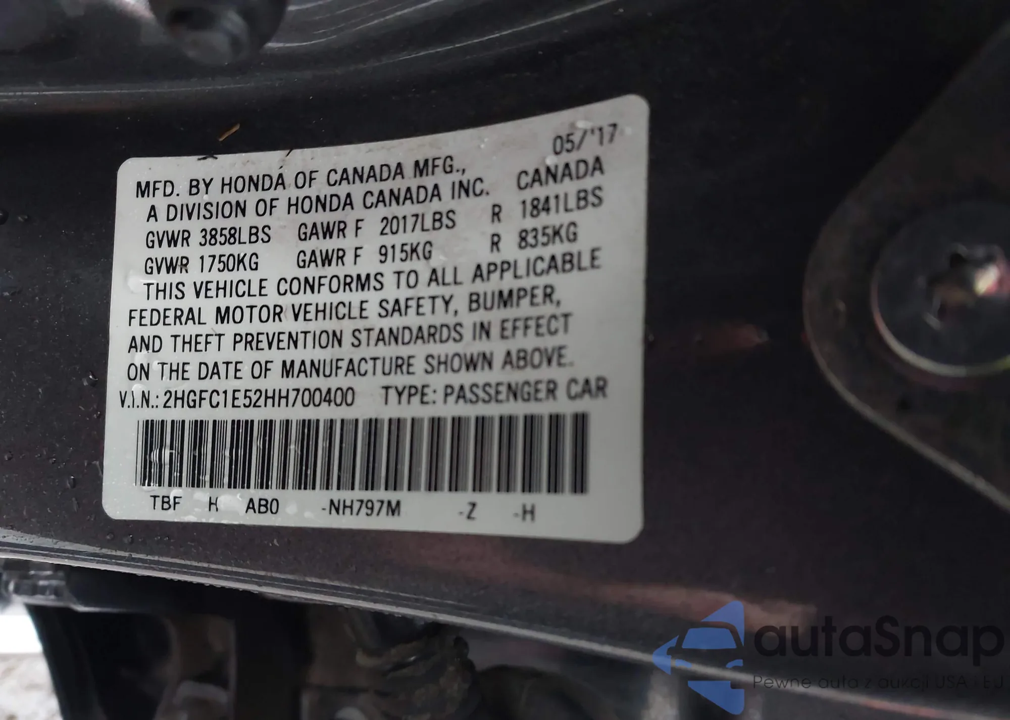 LOT: 44051039 VIN: 2HGFC1E52HH700400