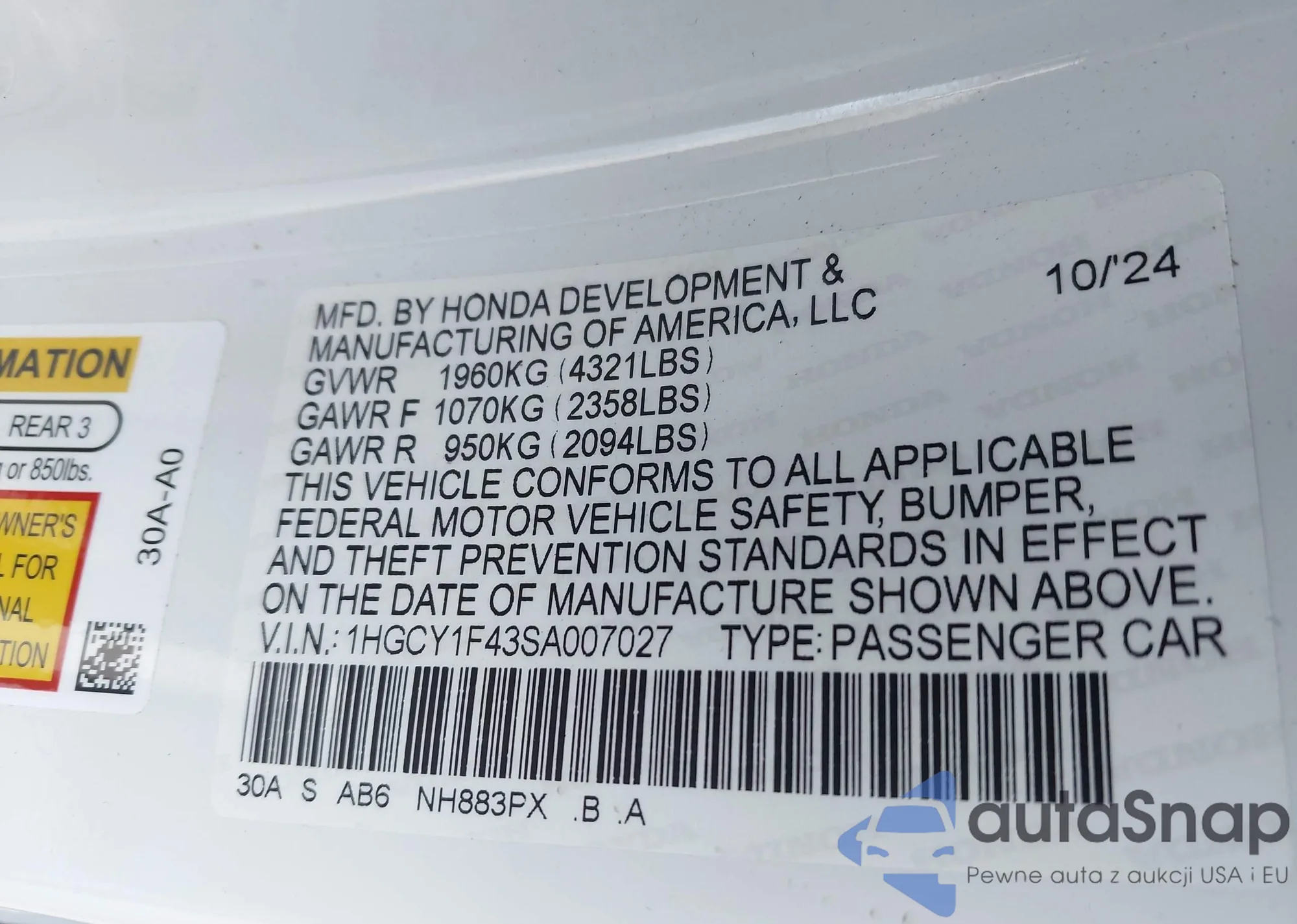 LOT: 41780259 VIN: 1HGCY1F43SA007027