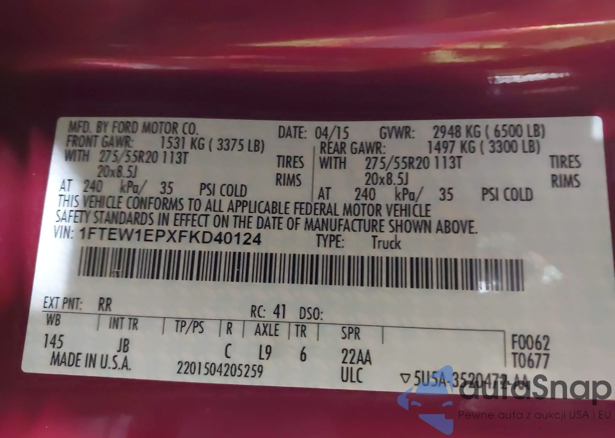 LOT: 43954265 VIN: 1FTEW1EPXFKD40124
