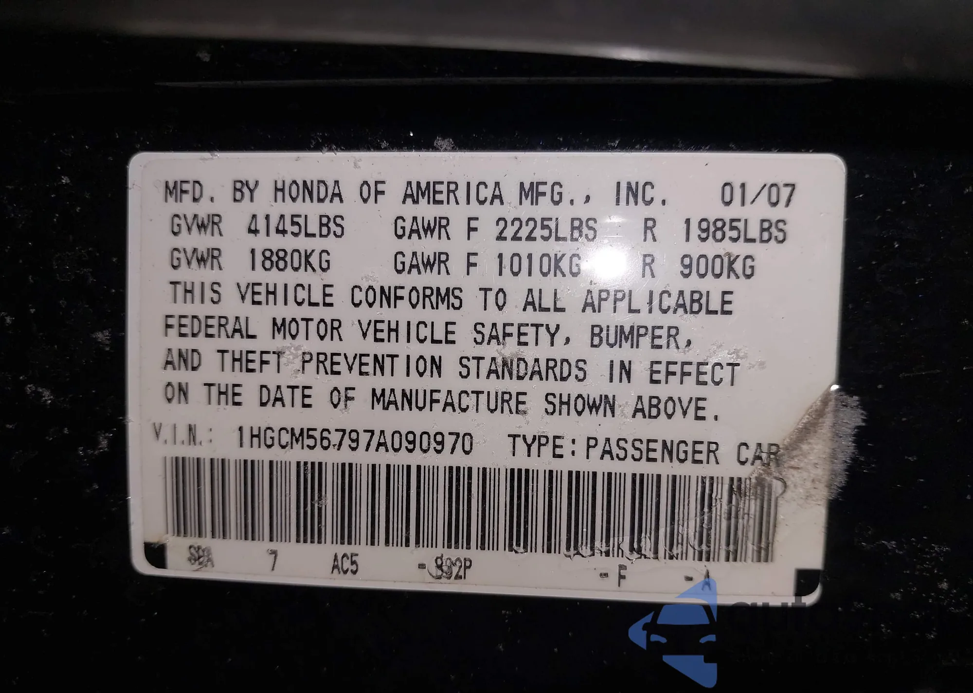 LOT: 44166543 VIN: 1HGCM56797A090970