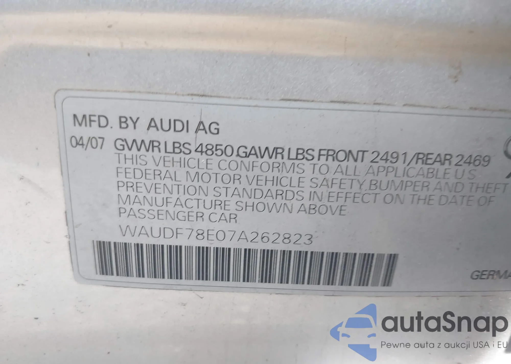 • VIN WAUDF78E07A262823