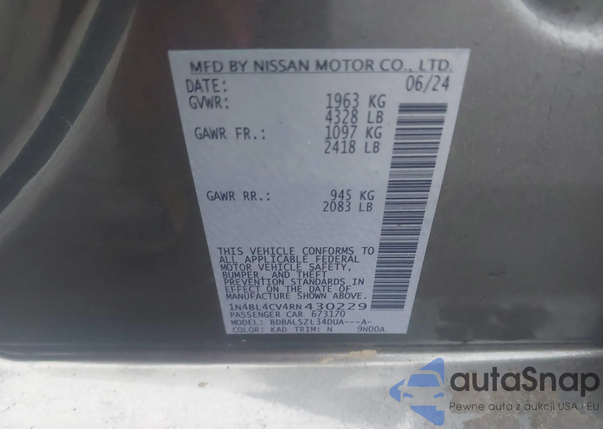 • VIN 1N4BL4DV6SN394421